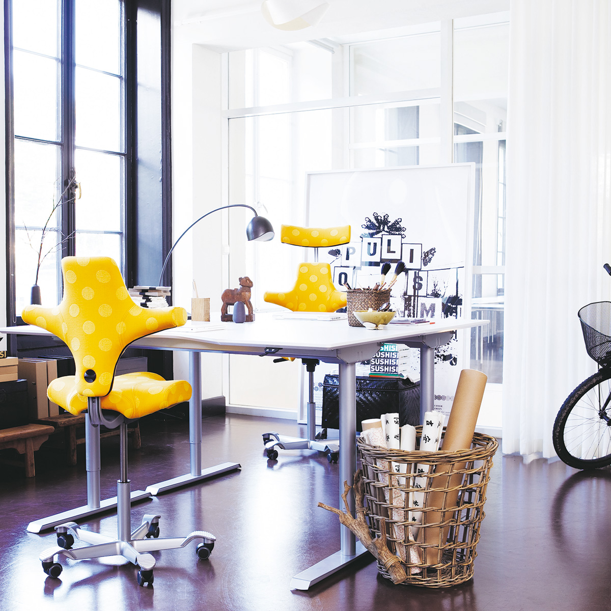 HAG Capisco regt zu mehr Bewegung, Abwechslung und völlig neuen und natürlichen Sitzpositionen an. Sie können Ihre Sitzposition auf dem Capisco jederzeit variieren. Nutzen Sie ihn als normalen Bürostuhl, drehen Sie sich um und nutzen Sie die Rückenlehne als Stütze oder setzen Sie sich einfach seitlich auf ihn. In jeder Position gibt Ihnen der HAG Capisco einen angenehmen Halt und eine weiche, angenehme Polsterung. Sitzhöhe, Sitztiefe, Rückenlehnenhöhe und der rückwärtige Neigungswiderstand lassen sich stufenlos verstellen. HAG Capisco ist für eine Nutzung von maximal 9 Stunden pro Tag ausgelegt.HighlightsHAG Capisco 8106 individuell über unseren Konfigurator zusammenstellenCapisco unterstützt Sie in jeder SitzpositionStufenlose Verstellung der Sitzhöhe, Sitztiefe und RückenlehnenhöheAnpassung des rückwärtigen Neigungswiderstandes sowie der ArretierungSo individuell wie Sie selbst: Verschiedene Farben und Stoffe zur AuswahlModerners Kunststoff- oder Aluminiumfußkreuz in verschiedenen FarbenZusätzliche Ebenen für das Aufstellung der Füße sowie ein Fußring erhältlichAbmessungenSitzhöhe bei 150 mm-Gasfeder: 408 - 540 mm (für kleinere Personen geeignet) Sitzhöhe bei 200 mm-Gasfeder: 470 - 655 mm (Standard, normaler Verstellbereich) Sitzhöhe bei 265 mm-Gasfeder: 555 - 810 mm (für Stehtische geeignet)Rückenlehnenhöhe: 460 mmSitztiefe: 340 - 420 mmSitzbreite: 470 mmMaximale Stuhlbreite: 595 mmDurchmesser des Fußkreuzes: 730 mmGewicht: 13,0 kg