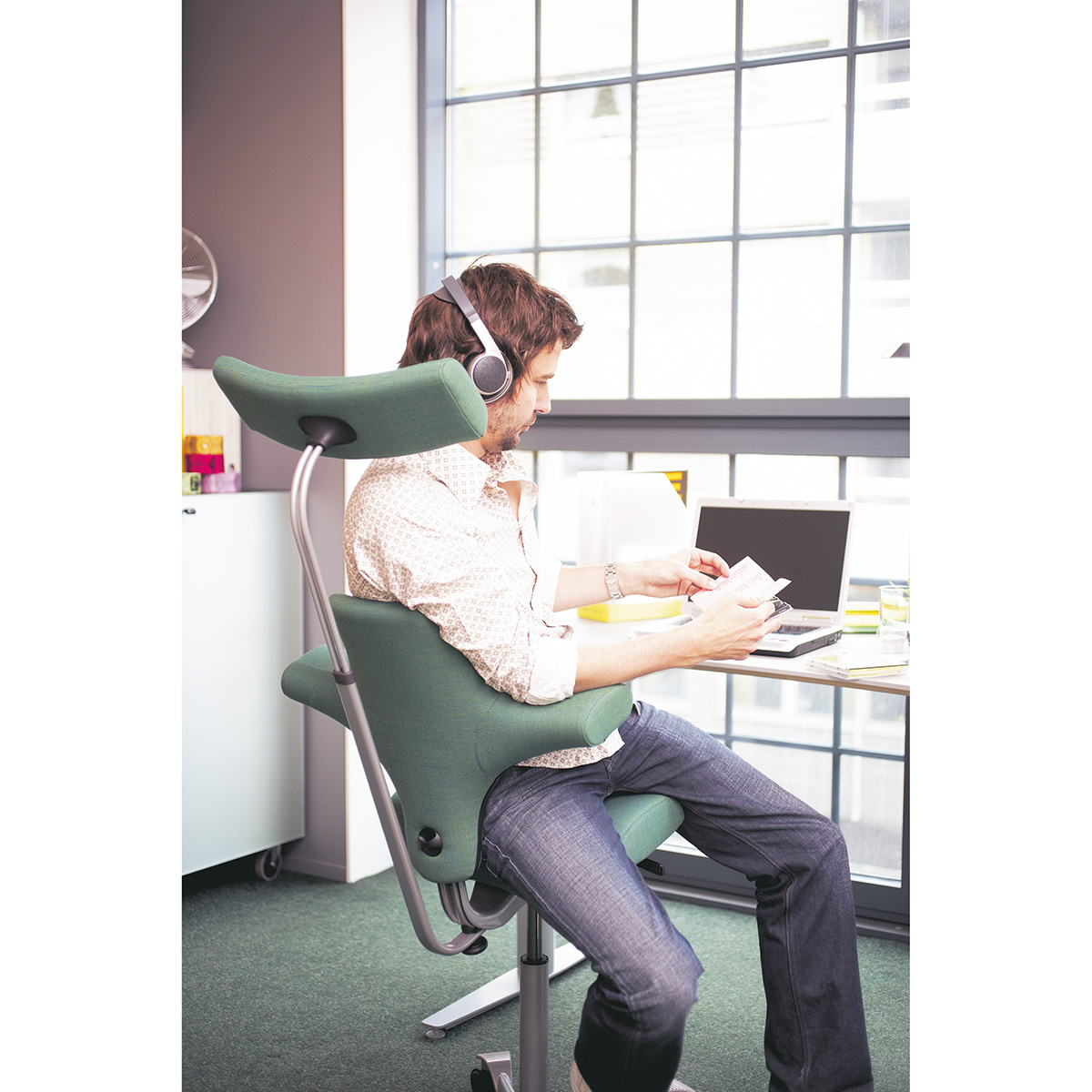 Das Modell 8127 des HAG Capisco kombiniert den Flachsitz normaler Bürodrehstühle mit den ergonomischen Hauptmerkmalen der Capisco-Serie: Die flexible, anpassbare Rückenlehne sowie die weiche, die Rückenmuskulatur entlastende Kopfstütze. Der Stuhl lässt sich in unserem Konfigurator farblich nach Ihrem persönlichen Geschmack designen. So entsteht ein HAG Capisco ganz nach Ihren Vorstellungen.HighlightsAnregung der natürlichen Bewegung durch innovatives DesignPerfekt geeignet für den Wechsel zwischen sitzen und stehen an einem höhenverstellbaren ArbeitsplatzHöhenverstellbare RückenlehneAnpassbare, flexible KopfstützeBezugsstoffe und -farben der HAG-Kollektion individuell konfigurierbarNachhaltigkeit bei HAG: Verwendung von 53 % recycletem Material aus Abfällen der Industrie und VerbraucherDesigner-Stuhlrollen für größtmögliche Bewegungsfreiheit im RaumAusstattungsmerkmaleSitzhöhen- und TiefenverstellungEinstellung der Rückenlehnen- und KopfstützenhöheVerschiedene Gasfedern für unterschiedliche Höhen erhältlichModernes 5-Fuß-Fußkreuz aus Kunststoff oder Aluminium in verschiedenen FarbenStoffe und Farben aus der HAG-Kollektion zur AuswahlEinfach online konfigurieren und nach Hause bestellenOptional: HAG StepUp für zwei zusätzliche Ebenen zum Aufstellen der Füße, HAG Footring für eine zusätzliche FußablageAbmessungenSitzhöhe bei 150 mm-Gasfeder: 408 - 540 mm (für kleinere Personen geeignet)Sitzhöhe bei 200 mm-Gasfeder: 470 - 655 mm (Standard, normaler Verstellbereich)Sitzhöhe bei 265 mm-Gasfeder: 555 - 810 mm (für Stehtische geeignet)Rückenlehnenhöhe: 460 mmHöhe der Kopfstütze: 555 - 785 mmSitztiefe: 340 - 420 mmSitzbreite: 470 mmMaximale Stuhlbreite: 595 mmDurchmesser des Fußkreuzes: 730 mmGewicht: 15,0 kg