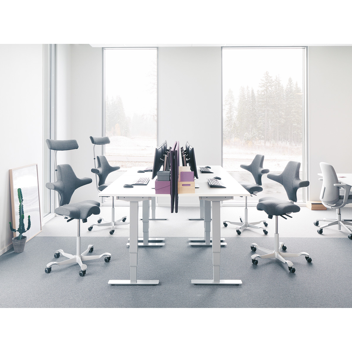 Erleben Sie modernes Sitzen mit dem HAG Capisco! Der Stuhl mit Sattelsitz passt sich perfekt an Ihre natürlichen Sitzbewegungen an. Nicht nur das: Sitzen Sie auf HAG Capisco nicht einfach wie auf einem normalen Stuhl - benutzen Sie ihn doch einfach verkehrtherum oder seitlich. Die ergonomische Rückenlehne unterstützt Sie dabei gerne in jeder Haltung. Unser Shop bietet Ihnen die Möglichkeit Ihren persönlichen HAG Capisco selbst zu konfigurieren - wählen Sie schnell und einfach zwischen verschiedenen Bezugsstoffen und Farben, modernen Fußkreuzen und natürlich den passenden Designer-Rollen für Ihren Fußboden. Das Modell 8107 kommt mit einer stylischen Kopfstütze daher, welche Ihren Kopf in einer natürlichen Haltung unterstützt und dabei gleichzeitig Rücken und Nacken entlastet.HightlightsHAG Capisco 8107 unterstützt das ergonomische Sitzen in jeder HaltungHAG verwendet für die Herstellung bis zu 53 % recycletes Material aus Verbrauchs- und Industrieabfällen und sorgt somit für eine nachhaltige ProduktionModerne, weiche und höhenverstellbare Kopfstütze zur Entlastung Ihrer Rücken- und NackenmuskulaturAktives Sitzen auch in einer fast stehenden PositionAusstattungSattelsitz, welcher sich Ihrer Sitzbewegung anpasstHöhenverstellung, SitztiefeneinstellungHöhenverstellbare RückenlehneAnpassung des rückwärtigen Neigungswiderstandes sowie der ArretierungOptionale Ebenen zum Aufstellen der Füße sowie Footring zur Variation und Bewegung der Füße durch eine zusätzliche HöheKunststoff- und Aluminium-Fußkreuze in verschiedenen Varianten zur AuswahlVerschiedene Bezugsstoffe und -farben aus der HAG Kollektion verfügbarGasfeder in drei Höhen verfügbar - passen Sie den HAG Capisco einfach der Höhe Ihrer Steh-Sitz-Kombination anAbmessungenSitzhöhe bei 150 mm-Gasfeder: 408 - 540 mm (für kleinere Personen geeignet) Sitzhöhe bei 200 mm-Gasfeder: 470 - 655 mm (Standard, normaler Verstellbereich) Sitzhöhe bei 265 mm-Gasfeder: 555 - 810 mm (für Stehtische geeignet)Rückenlehnenhöhe: 460 mmHöhe der Kopfstütze: 555 - 785 mmSitztiefe: 340 - 420 mmSitzbreite: 470 mmMaximale Stuhlbreite: 595 mmDurchmesser des Fußkreuzes: 730 mmGewicht: 14,5 kg