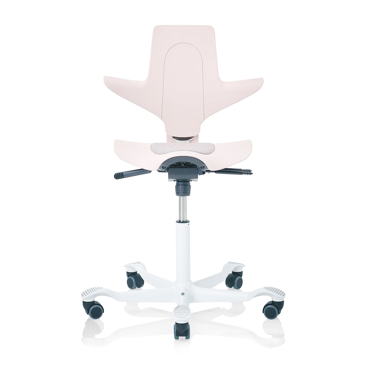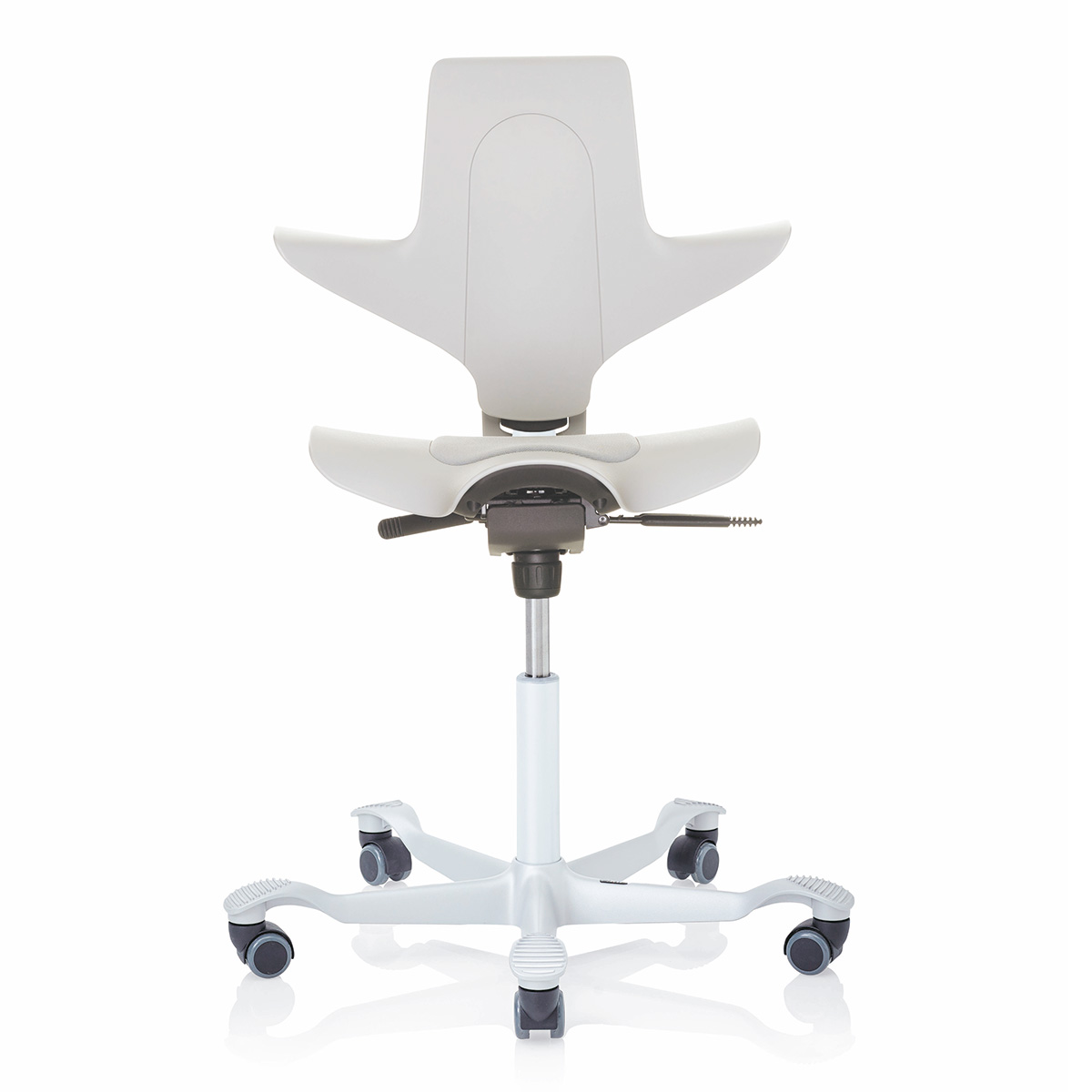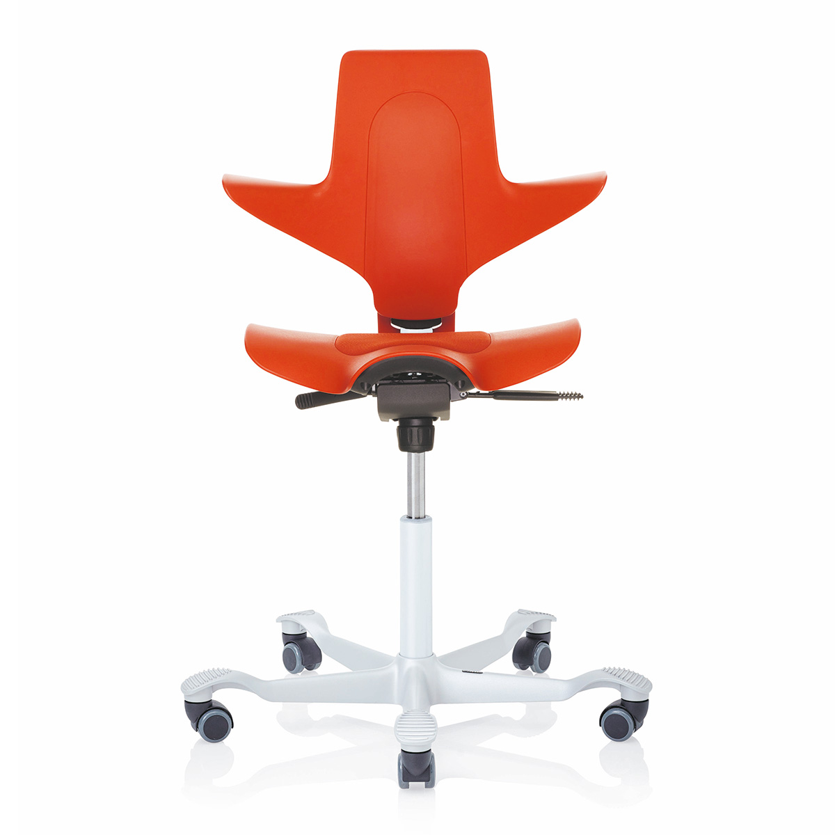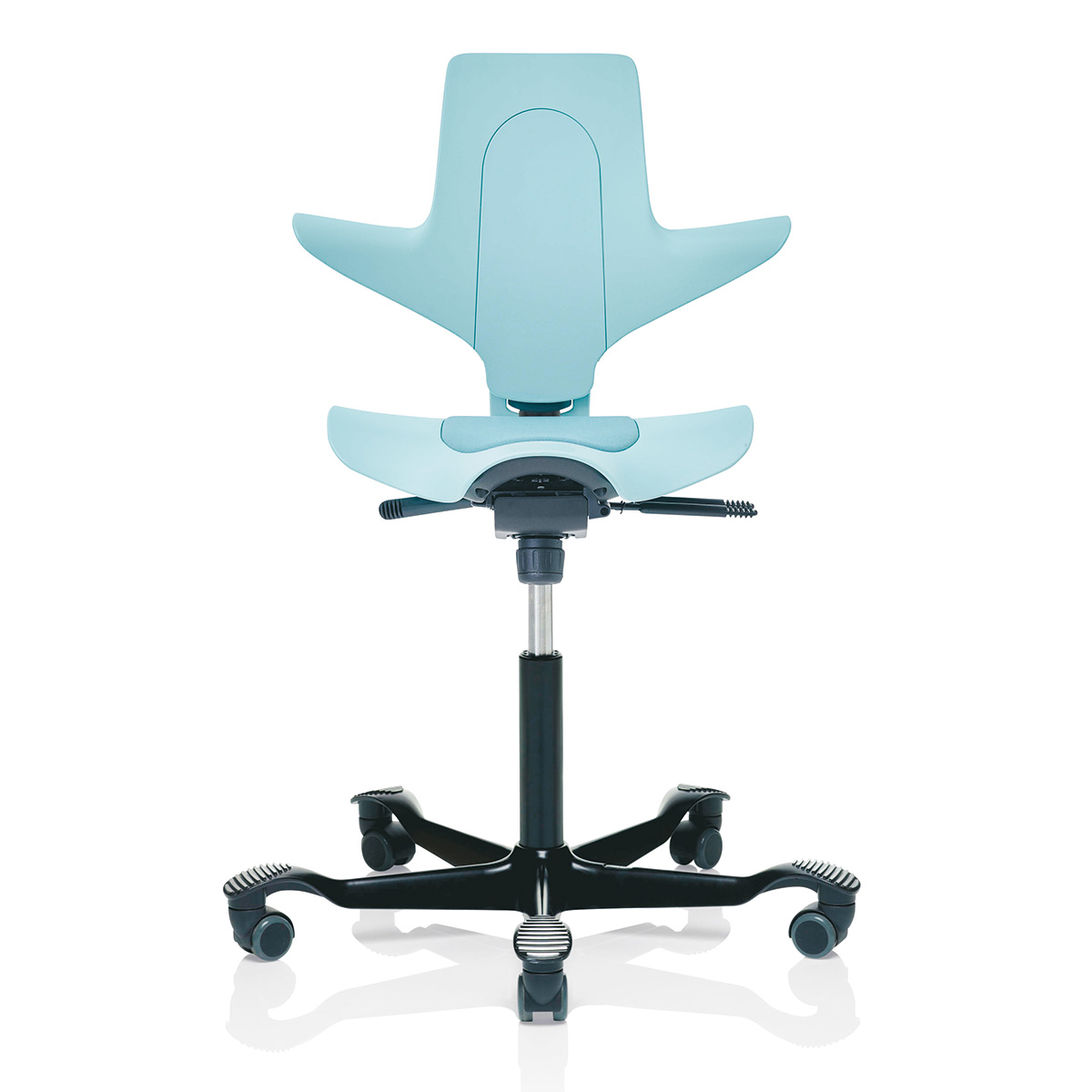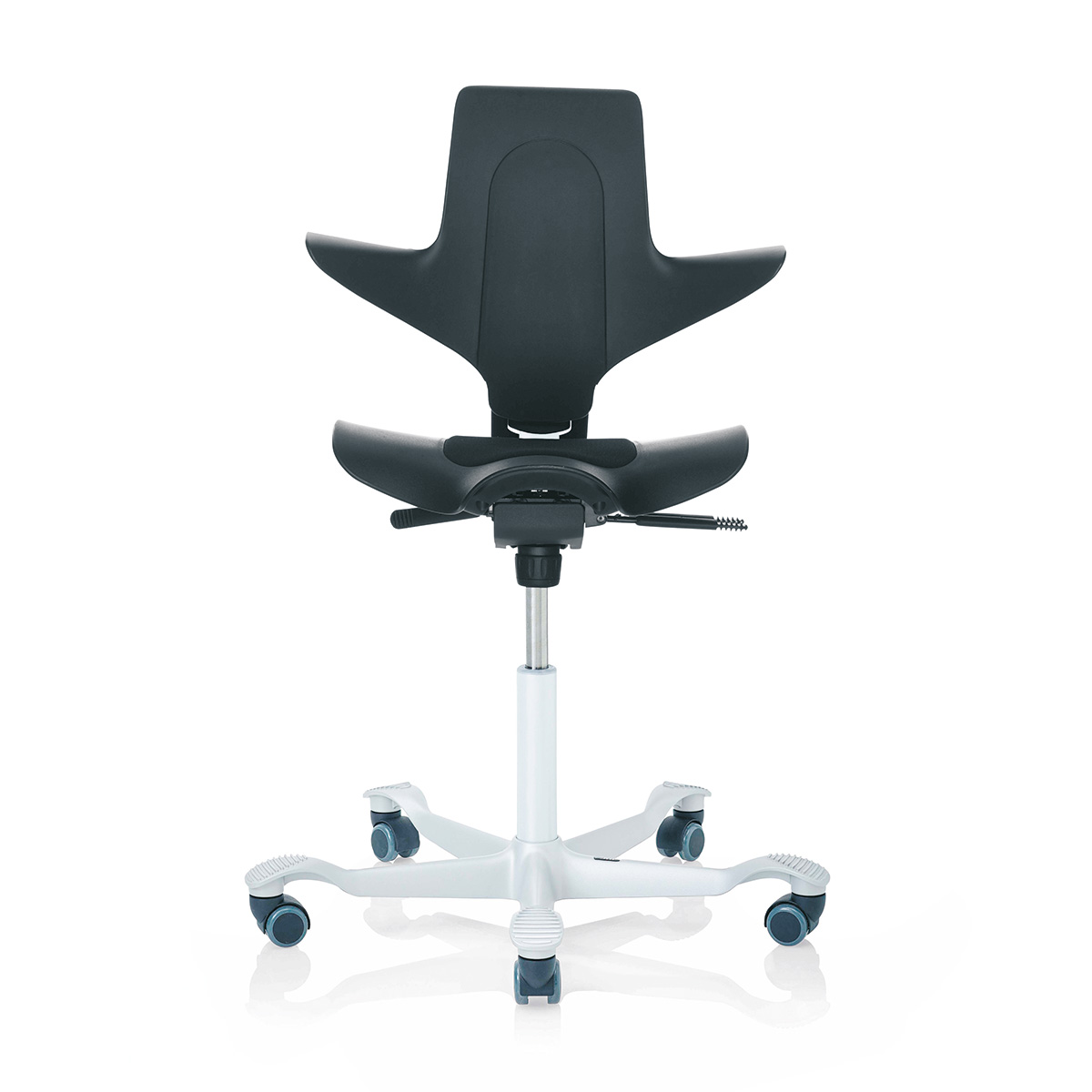 Wem der Sattelsitz des HAG Capisco 8106 nicht gefällt, der findet bei diesem Modell alle ergonomischen Eigenschaften des HAG Capisco in Verbindung mit einem normalen Flachsitz vereint. Das Modell 8126 bietet alle ergonomischen Eigenschaften der klassischen Capisco-Modelle, gleichzeitig jedoch auch das normale Sitzgefühl eines Standard-Bürodrehstuhls. Die Feder des HAG Capisco ist in drei Höhen erhältlich, sodass sowohl normales Arbeiten im Sitzen als auch in einer nahezu stehenden Position ermöglicht wird. Durch unseren modernen Online-Konfigurator können Sie den HAG Capisco nach Ihren Wünschen farblich gestalten.HighlightsModerne Rückenlehne in Capisco-Form: Nutzen Sie sie in jeder erdenklichen SitzpositionAnsprechende Bezugsauswahl: Gestalten Sie HAG Capisco in Ihren Wunschfarben oder passend zu Ihrem Corporate DesignDrei verschiedene Gasfedern passend zu Ihrer Arbeitshöhe erhältlichNachhaltige Produktion bei HAG: Verwendung von 53 % recycletem Material aus Verbrauchs- und IndustrieabfällenAusstattungErgonomischer FlachsitzRückenlehne in Capisco-Form, passt sich jeder Sitzhaltung anHöhenverstellungSitztiefenverstellungEinstellung der RückenlehnenhöheJustierung des rückwärtigen Neigungswiderstandes sowie ArretierungVerfügbar in verschiedenen Stoffen und Bezugsfarben der HAG-KollektionHochwertiges Kunststoff- oder Aluminium-Fußkreuz in schwarz, silber, weiß oder poliertMit dem optionalen HAG StepUp lässt sich der HAG Capisco um zwei zusätzliche Ebenen für das Aufstellen der Füße erweiternOptionaler HAG Footring ermöglicht eine Variation der Höhe und Bewegungsfreiheit für die FüßeAbmessungenSitzhöhe bei 150 mm-Gasfeder: 408 - 540 mm (für kleinere Personen geeignet) Sitzhöhe bei 200 mm-Gasfeder: 470 - 655 mm (Standard, normaler Verstellbereich) Sitzhöhe bei 265 mm-Gasfeder: 555 - 810 mm (für Stehtische geeignet)Rückenlehnenhöhe: 460 mmSitztiefe: 340 - 420 mmSitzbreite: 470 mmMaximale Stuhlbreite: 595 mmDurchmesser des Fußkreuzes: 730 mmGewicht: 13,5 kg