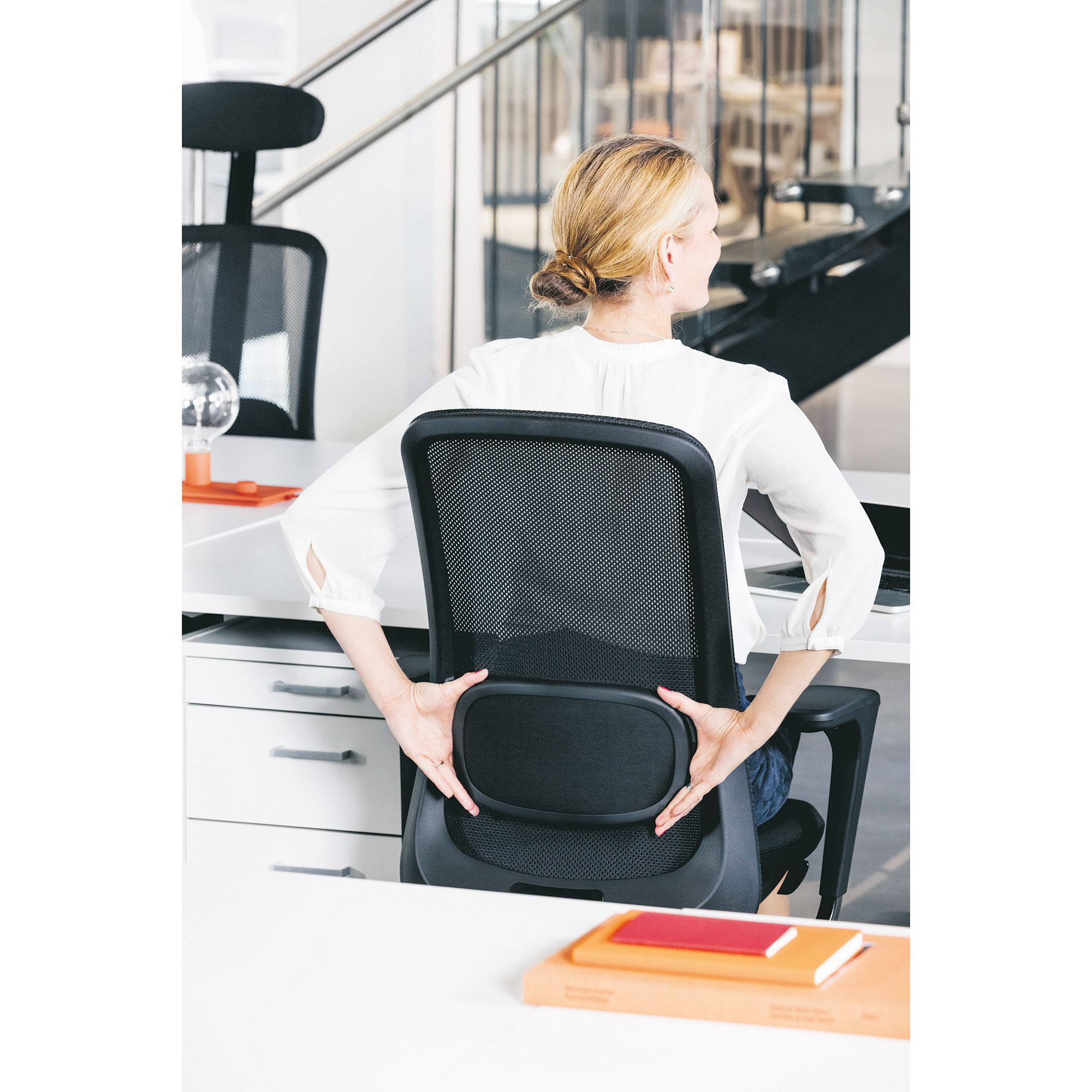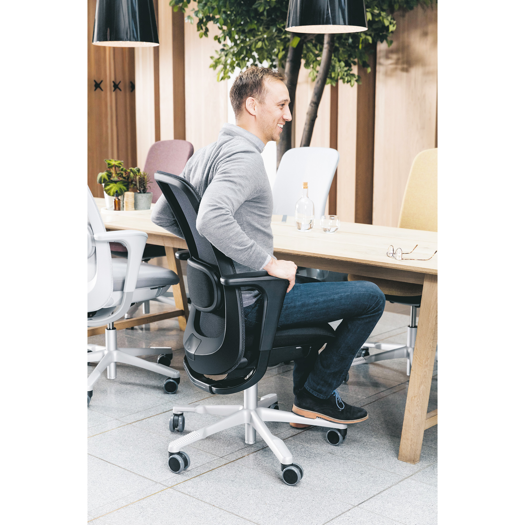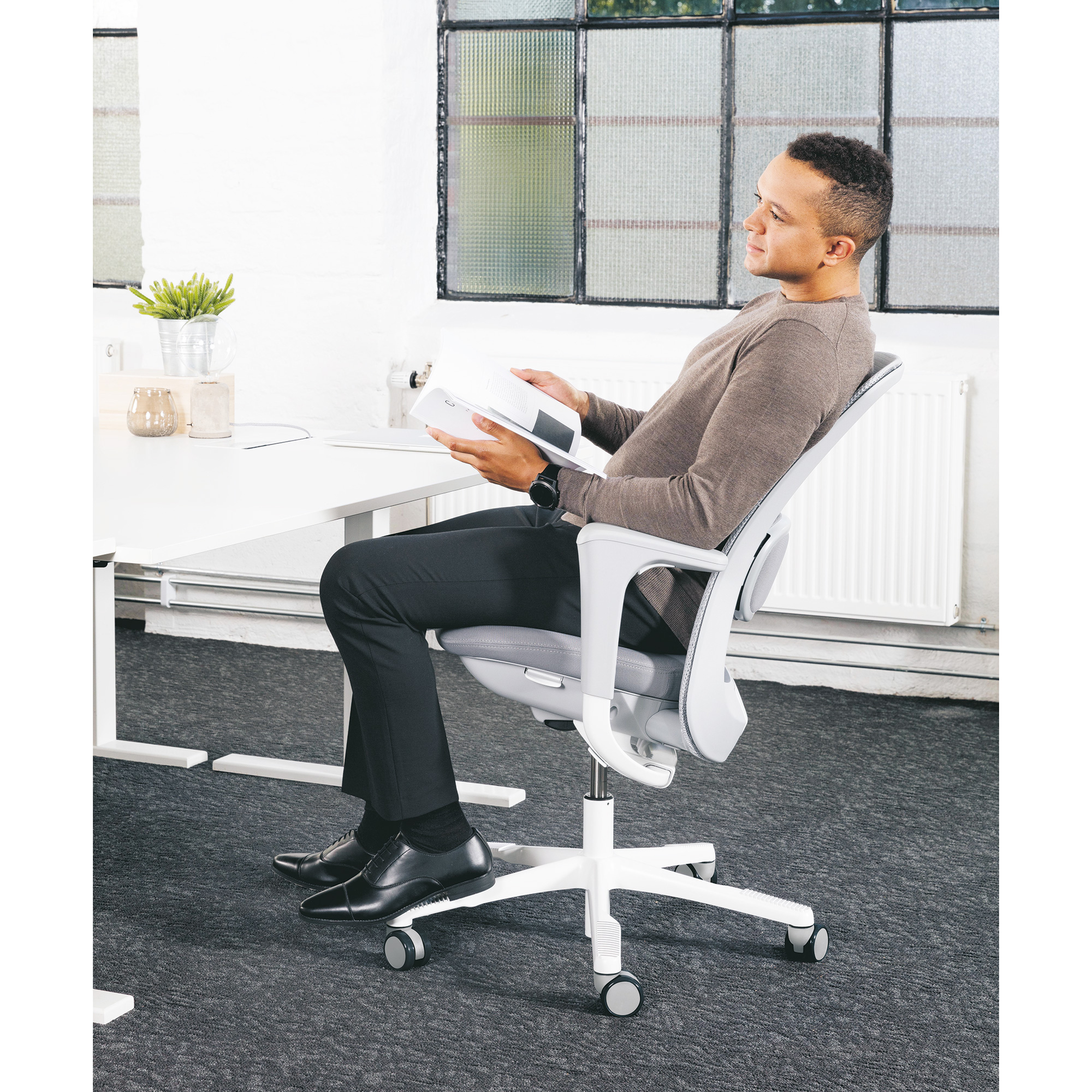 Der moderne Stuhl für das Home Office - HAG SoFi Mesh 7500 - bringt Farbe und Bewegung in den Alltag. SoFi Mesh vereint alle Eigenschaften der Marke HAG: Hoher Komfort, extrem einfache Bedienung, unbegrenzte Sitzflexibilität und maximale Bewegungsfreiheit. Bereits in der Grundausstattung verfügt der HAG SoFi Mesh über eine integrierte und einstellbare Lordosenstütze, einen verstellbaren Neigungswiderstand, eine Arretierung und das HAG-Fußkreuz mit den beliebten Auflageflächen für die Füße. Die weichen und runden Formen des HAG SoFi Mesh sorgen in Verbindung mit dem luftigen Netzrücken für ein unauffälliges aber warmes Design, welches sich nahtlos in jedes Büro oder Home Office integrieren lässt. Die individuelle Anpassung der Farben sorgt für eine gewisse Individualisierung. Die Stoffapplikation auf dem Rücken der Lordosenstütze spiegelt die Farbe des Sitzbezugs wider. Die HAG in Balance-Technologie verleitet zum bewegten Sitzen - so bleiben Sie jederzeit wach und konzentriert.Ausstattungsmerkmale des HAG SoFi Mesh 7500HAG in Balance-Technologie unterstützt den natürlichen Bewegungsdrang des MenschenSitzhöheneinstellungSchiebesitz zur Verstellung der SitztiefeLordosenstütze in der Höhe verstellbarNeigungswiderstand der Rückenlehne justierbarRückenlehne lässt sich arretierenDas Fußkreuz besitzt auf jedem Arm eine Ablagefläche für die Füße - legen Sie einfach Ihre Füße auf dem Fußkreuz statt auf dem Fußboden abOptional erhältliche Armlehnen, welche in der Höhe und Breite verstellbar sindOptionale HAG SlideBack-Funktion - schieben Sie die Armlehnen mit einer Bewegung einfach zurück, sodass Sie näher an Ihren Tisch heranrücken oder sich seitwärts auf den Stuhl setzen könnenHAG SoFi Mesh lässt sich mit einer höhen- und tiefenverstellbaren Kopfstütze ausstatten, welche in der Farbe des Sitzbezugs bezogen ist. Die Kopfstütze lässt sich auch nachrüsten.Einfache Pflege: Netzgewebe und Sitzbezug können mit einer Polsterbürste oder einem weißen Tuch oder Schwamm trocken oder feucht gereinigt werdenNachhaltige Produktion, einfache Demontage und RecyclingWeiche Rollen für alle harten Böden oder harte Rollen für Teppichböden verfügbarAbmessungen und Sitzhöhen des HAG SoFi Mesh 7500Sitzhöhe mit 165 mm Gasfeder (Standard): 395 - 545 mmSitzhöhe mit 200 mm Gasfeder: 450 - 640 mmHöhe des Rückenpolsters: 720 mmSitztiefe verstellbar: 380 - 460 mmArmlehnenhöhe: 185 - 300 mmSitzbreite: 450 mmMaximale Stuhlbreite: 600 - 715 mmDurchmesser Fußkreuz: 730 mmGewicht ohne Armlehnen: 17,0 kgBenötigen Sie Unterstützung bei der Konfiguration oder haben weitere Detailfragen? Unsere Ergonomie-Experten helfen Ihnen gerne bei der Auswahl Ihres neuen HAG SoFi Mesh 7500 Bürodrehstuhls.