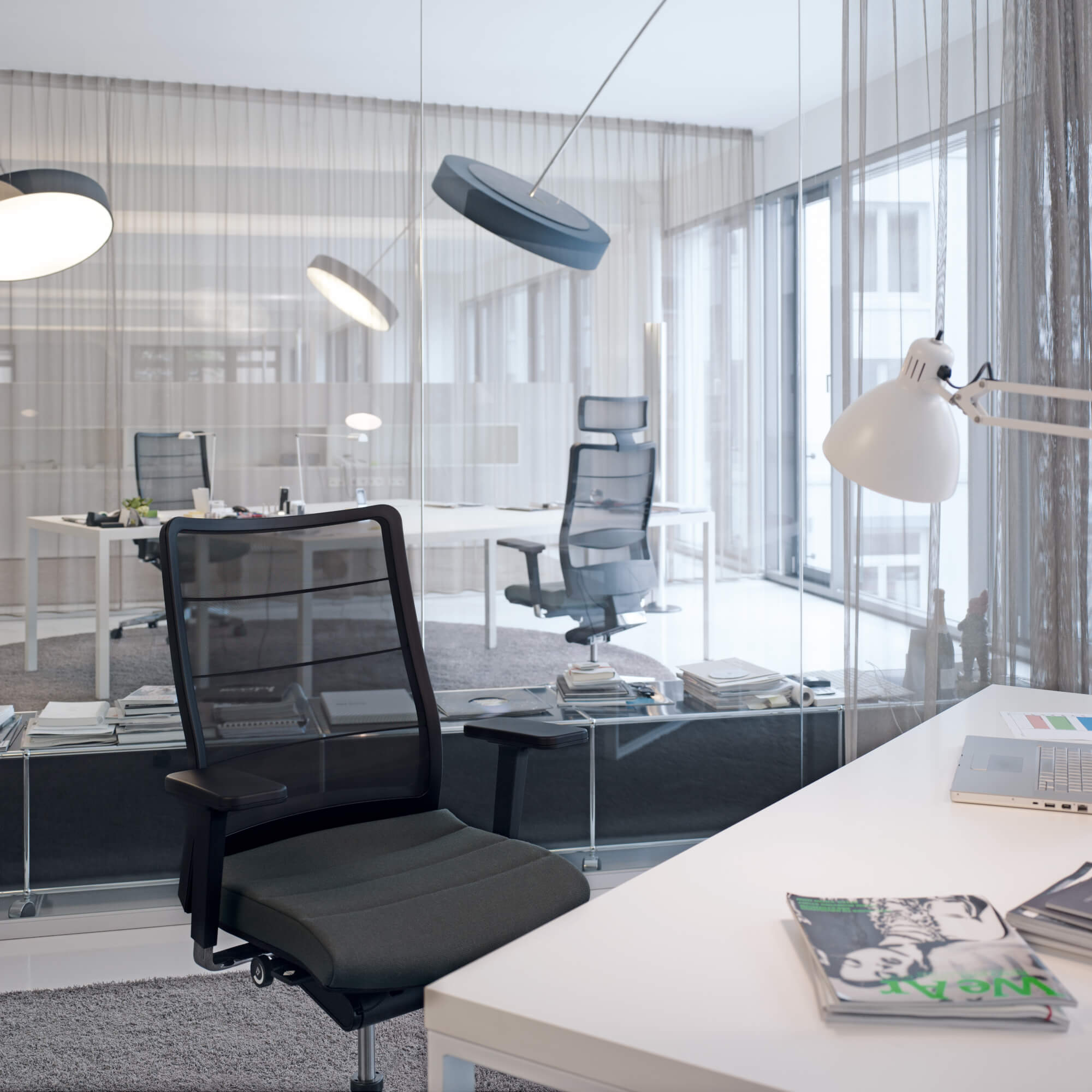 Funktionale 4D-Armlehnen, eine perfekt sitzende Body-Float-Synchronmechanik für maximalen Komfort, die membranbespannte Rückenlehne sowie die stufenlose Gewichtsregulierung bis hin zu einer Belastung von 140 kg halten jedem Vergleich stand.
