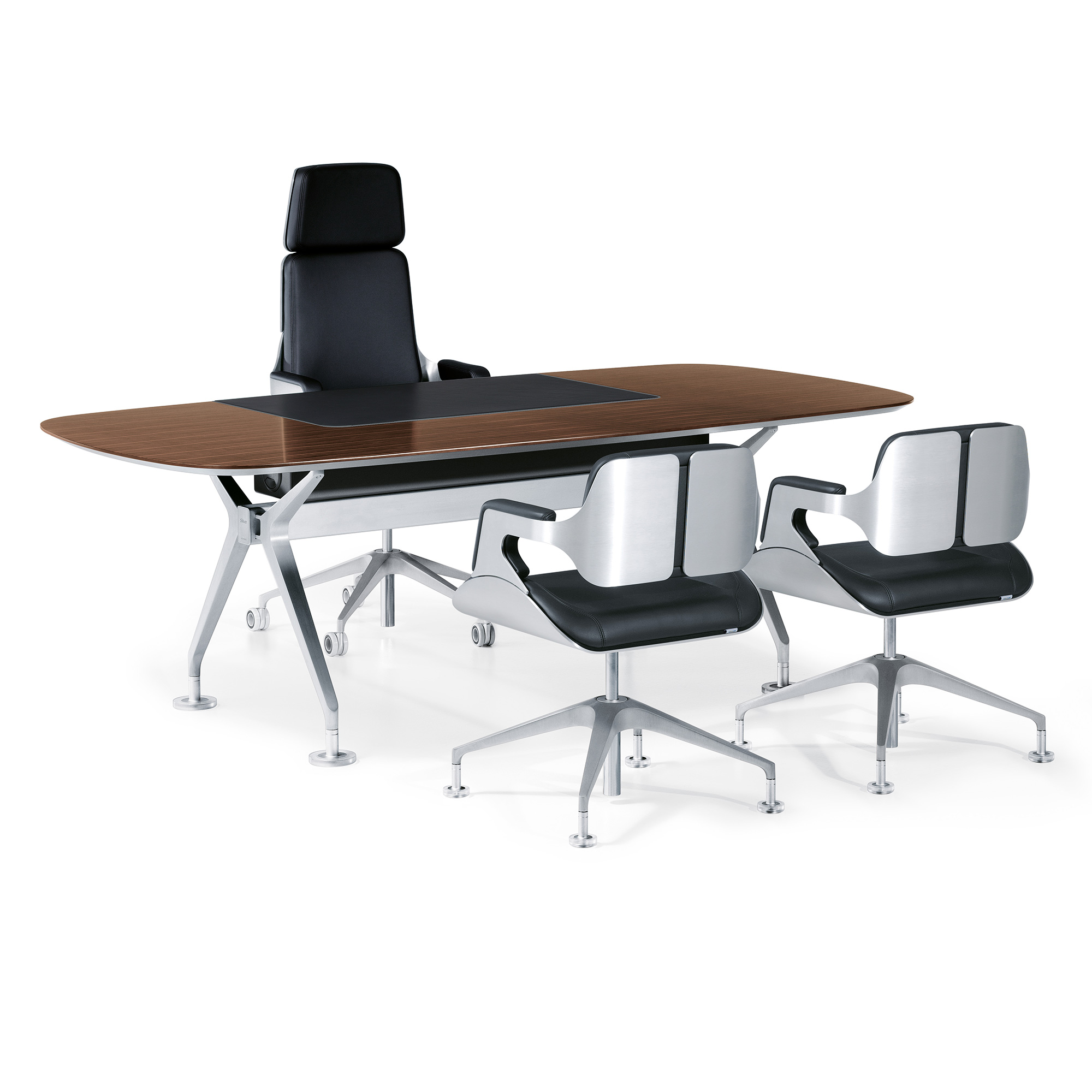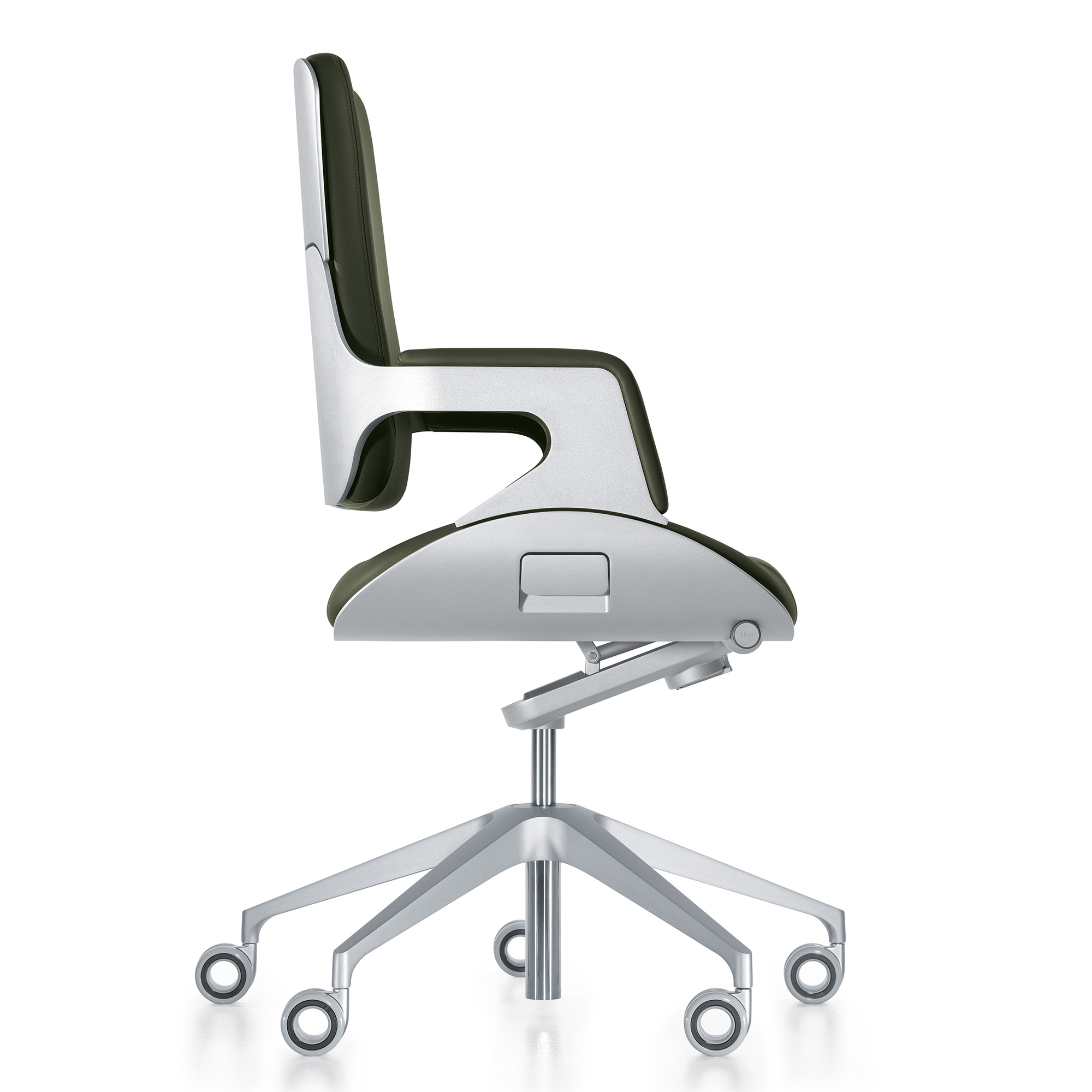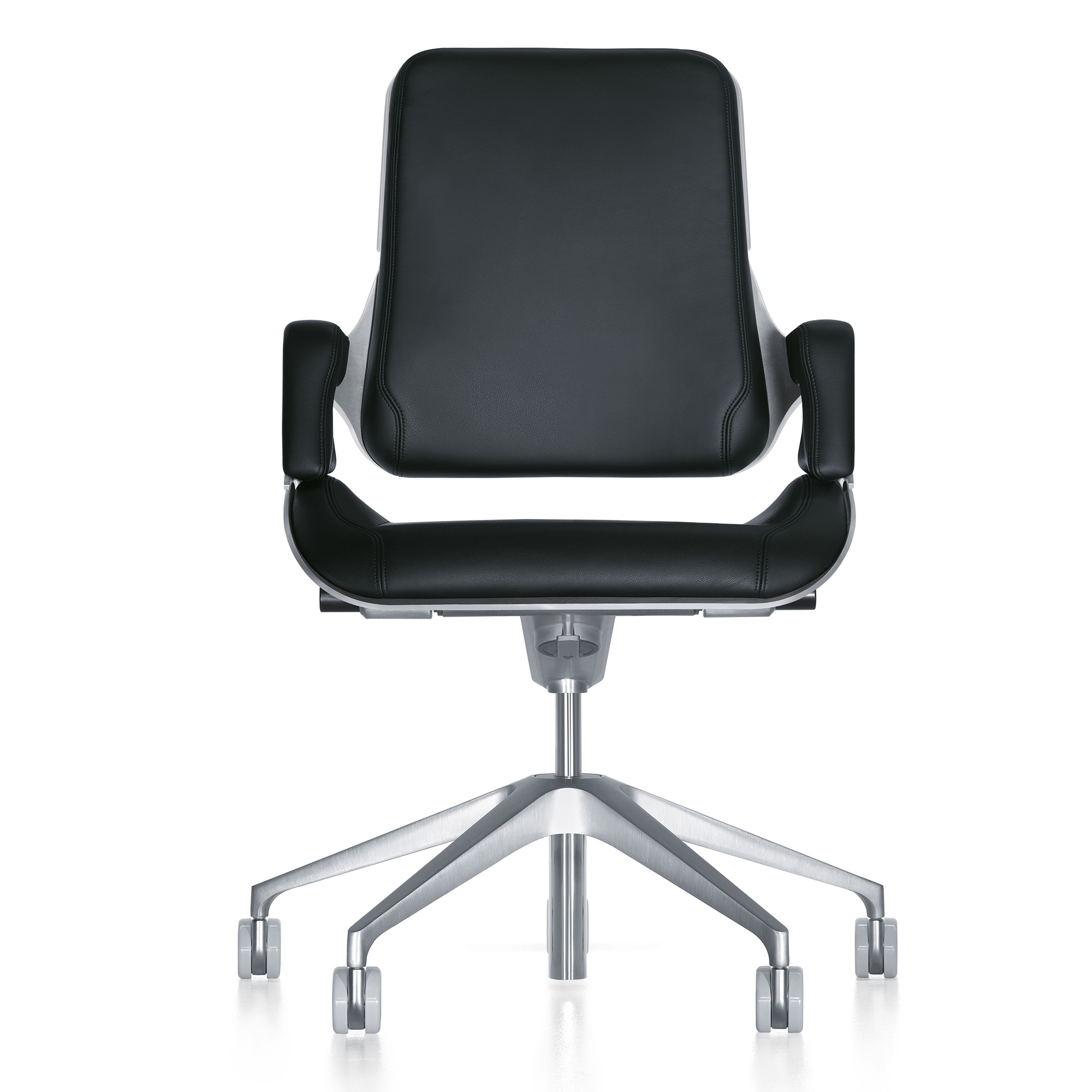 Interstuhl Silver 362S - der Chefbüro-Klassiker von Interstuhl. Designer: Hadi Teherani. Der Silver 362S besticht durch Klarheit in der Gestaltung und die konsequente und kompromisslose Umsetzung der Design-Idee. Im Fokus stehen die Wertigkeit der verwendeten Materialien und Oberflächen. Der optionale Lederbezug rundet das präzise Design durch eine klare Aussage ab. Die präzise Formensprache des Interstuhl Silver 362S Bürostuhls für Chefbüros erzeugt ein eindeutiges Bild - markant und trotzdem ruhig. Präsent in jedem Raum - ob Chefbüro, Konferenzraum oder Privatbibliothek. Die Formen des Silver 362S erinnern an Elemente aus dem hochwertigen Fahrzeugbau. Die Integration der Sitzmechanik in die markante Sitzschale erzeugt ein nahtloses Exterieur. Der Interstuhl Silver 362S lässt sich mühelos einstellen - der in das nahtlose Design integrierte Hebel auf der rechten Seite sorgt für die Einstellung der Sitzhöhe. Der Hebel auf der linken Seite hingegen arretiert die Rückenlehne in Ihrer gewünschten Sitzposition. Die elegant verstecke Kurbel unter der Sitzfläche bestimmt den Gegendruck der Rückenlehne mit wenigen Handgriffen passend zu Ihrem Körpergewicht. Konfigurieren Sie sich noch heute Ihren persönlichen Interstuhl Silver 362S in unserem 3D-Konfigurator.Ausstattung des Interstuhl Silver 362SHohe Rückenlehne mit integrierter KopfstützeSitz, Rücken und Armlehnen sind gepolstert, die Stoffe lassen sich sowohl in der Art der Stoffe als auch der Farbe frei wählenSynchronmechanik, welche Sitz und Rücken synchron bewegen lässt, die Rückenlehne lässt sich arretieren, der Gegendruck lässt sich per Kurbel unter dem Sitz einstellenGeeignet für personen von 50 bis 120 kgWahlweise weiche Rollen für alle harten Böden oder harte Rollen für TeppichbodenHaltbares Aluminiumfußkreuz, farblich passend zu allen weiteren Aluminiumteilen des Interstuhl Silver BürostuhlsMetallteile wahlweise pulverbeschichtet weiß oder gebürstet silber, glänzendUmweltfreundlicher Materialeinsatz: Sämtliche Materialien sind recyclebarAnsprechendes und zeitloses Design, ein Aluchair-KlassikerSofort einsatzbereit - der Stuhl wird fertig montiert bei Ihnen angeliefertAbmessungen des Interstuhl Silver 362SHöhe der Rückenlehne: 800 mmSitzhöhe: 410 - 510 mmSitzbreite: 480 mmSitztiefe: 480 mmGesamthöhe: 1320 mmGesamtbreite: 580 mmGesamttiefe: 720 mmGewicht: 40 kgHaben Sie weitere Fragen zu den Ausstattungsmerkmalen des Interstuhl Silver 362S Bürostuhls? Unsere Ergonomie-Experten beraten Sie gerne.