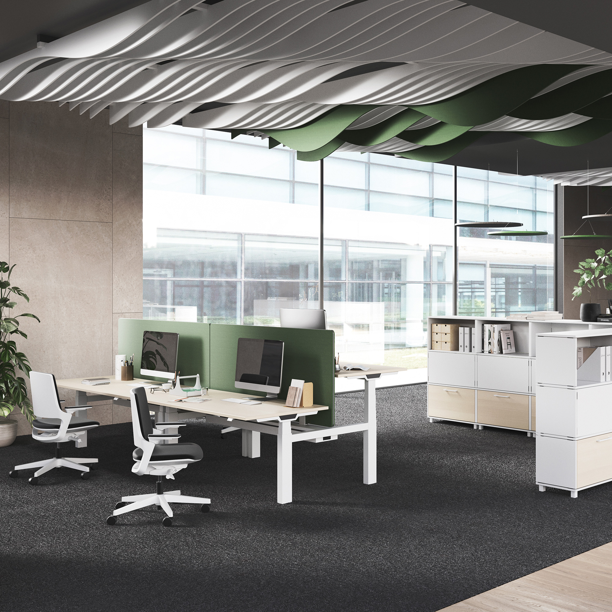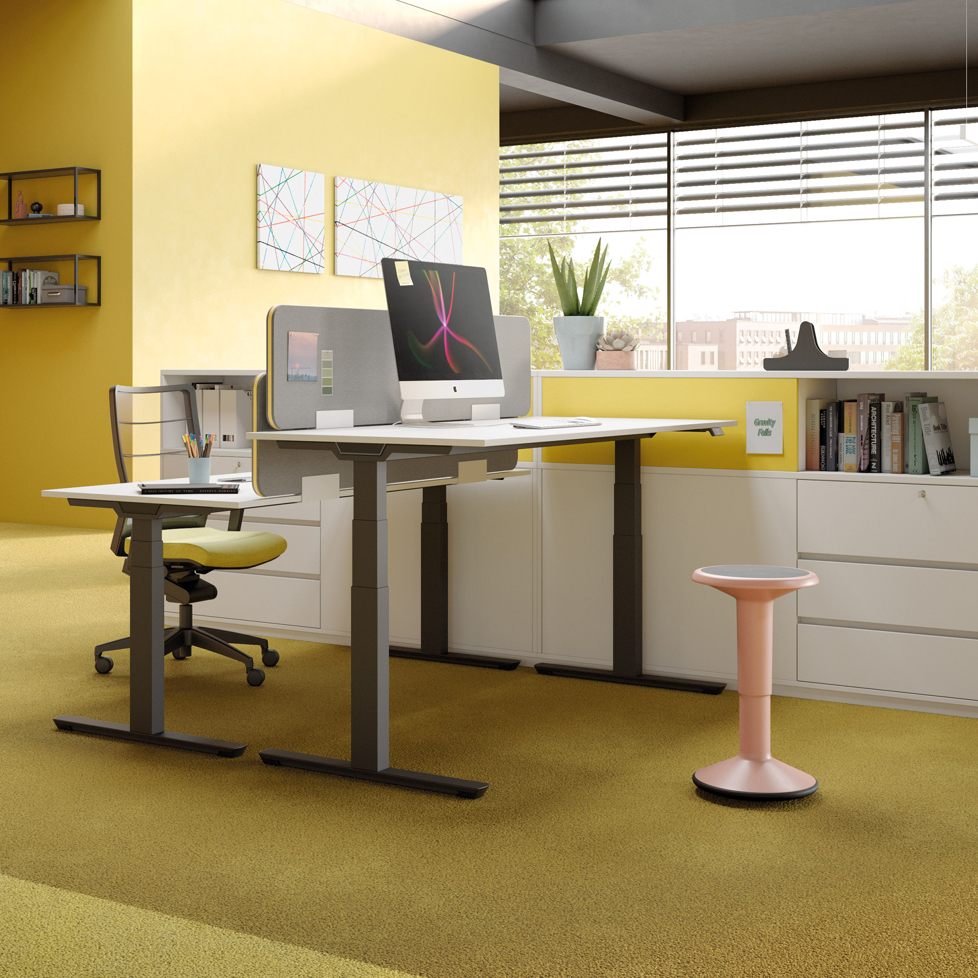 Mit dem höhenverstellbaren Tisch der FLEX COLLECTION lässt es sich jederzeit und überall angenehm arbeiten. Das Highlight der FLEX COLLECTION: Alle Elemente - inklusive den elektrisch höhenverstellbaren Tischen - lassen sich schnell und einfach verschieben, neu anordnen und ermöglichen sowohl spontane Teammeetings als auch optisch getrennte Einzelarbeitsplätze, welche die Konzentration des Nutzers fördern. Die höhenverstellbaren Schreibtische der FLEX COLLECTION besitzen ein einzigartiges Gestell mit vier integrierten Rollen, einer stabilen Quertraverse, eine angenehme Höhenverstellung inklusive zwei Speicherplätzen und viele weitere Features, welche keine Wünsche offen lassen. Der Schreibtisch ist in diversen Breiten von 1.200 mm bis 1.800 mm erhältlich. Weitere Anbauelemente, wie beispielsweise der Auftisch-Sichtschutz für ein räumlich getrenntes Arbeiten sowie der werkzeuglose Kabelkanal unter dem Tisch, bestehen aus einem angenehmen Filzmaterial, welches sich in hochwertiger Weise optisch vom Schreibtisch absetzt. Selbstverständlich bietet der elektrisch höhenverstellbare Schreibtisch der FLEX COLLECTION einen Piezo-Kollisionssensor um Beschädigungen an sonstigen Einrichtungsgegenständen vorzubeugen. Das neuartige Active-Touch-Bedienpanel sorgt für einige Neuerungen unter den elektromotorischen Schreibtischen: Die Double-Tap-Funktion sorgt für eine Höhenverstellung ohne dauerhaftes Drücken von Knöpfen. Der Schreibtisch fährt wie von selbst bis zur gespeicherten Höhe und stoppt im Anschluss ebenso selbstständig. Die Active-Motion-Haltungserinnerung unterstützt Sie beim regelmäßigen Wechseln vom Sitzen zum Stehen und umgekehrt durch ein kurzes, haptisches Signal nach der gewünschten Zeit. Die höhenverstellbaren Schreibtische der Steelcase FLEX COLLECTION lassen sich mit weiterem Zubehör optimal ausstatten: Elektrifizierungsoptionen unter und auf dem Tisch, eine CPU-Halterung, Monitorarme, Sichtschutzwände sowie einem Kabelkanal aus Filz, welcher sich werkzeuglos aufklappen lässt. Konfigurieren Sie noch heute Ihren Traum-Schreibtisch mit der Steelcase FLEX COLLECTION. Ausstattungsmerkmale der elektrisch höhenverstellbaren Tische Elektrische Höhenverstellung von 650 bis 1.250 mm (zweistufiges Gestell) Tischplattenbreite: Wählbar von 1.200 bis 1.800 mm Tischplattentiefe: 600 mm oder 800 mm Quertraverse sorgt für einen stabilen Halt, die Designer-Fußgestelle werden direkt an der Traverse befestigt Gestell mit vier Rollen und zusätzlichen Standfüßen für einen sicheren Stand und eine sekundenschnelle Mobilisierung des Tisches Bereits im Standard mit einem Active-Touch-Bedienpanel ausgestattet, welches zwei Memory-Plätze bietet, mit der Touble-Tap-Funktion eine automatische Höhenverstellung mit sich bringt sowie per App steuerbar ist Piezo-Kollisionssensor Integriertes 3m-Stromkabel Optionale Elektrifizierung unter dem Tisch - wahlweise mit sechs Steckdosen oder neun Steckdosen - und auf dem Tisch, wahlweise mit Strom oder Strom und USB-Ladebuchsen Kabelkanal aus kunstvoll geformten und stabilen PET-Filz erhältlich Tischplatte in allen Farben aus der Steelcase Oberflächenkollektion konfigurierbar Das Gestell lässt sich farblich von der Tischplatte absetzen, vielen moderne Farben wie Aubergine oder Wasabi zur Auswahl Optionale CPU-Halterung sowie ein Sichtschutz mit Magnethalterung über die Artikelsuche verfügbar Gewicht: Je nach Breite und Optionen von 45 kg bis 56,7 kg Sind weitere Fragen offen oder benötigen Sie ein individuelles Angebot für Ihre Betriebsausstattung oder Ihr neues Home Office? Wir stehen Ihnen mit unseren Einrichtungsexperten gerne telefonisch und per E-Mail zur Verfügung.