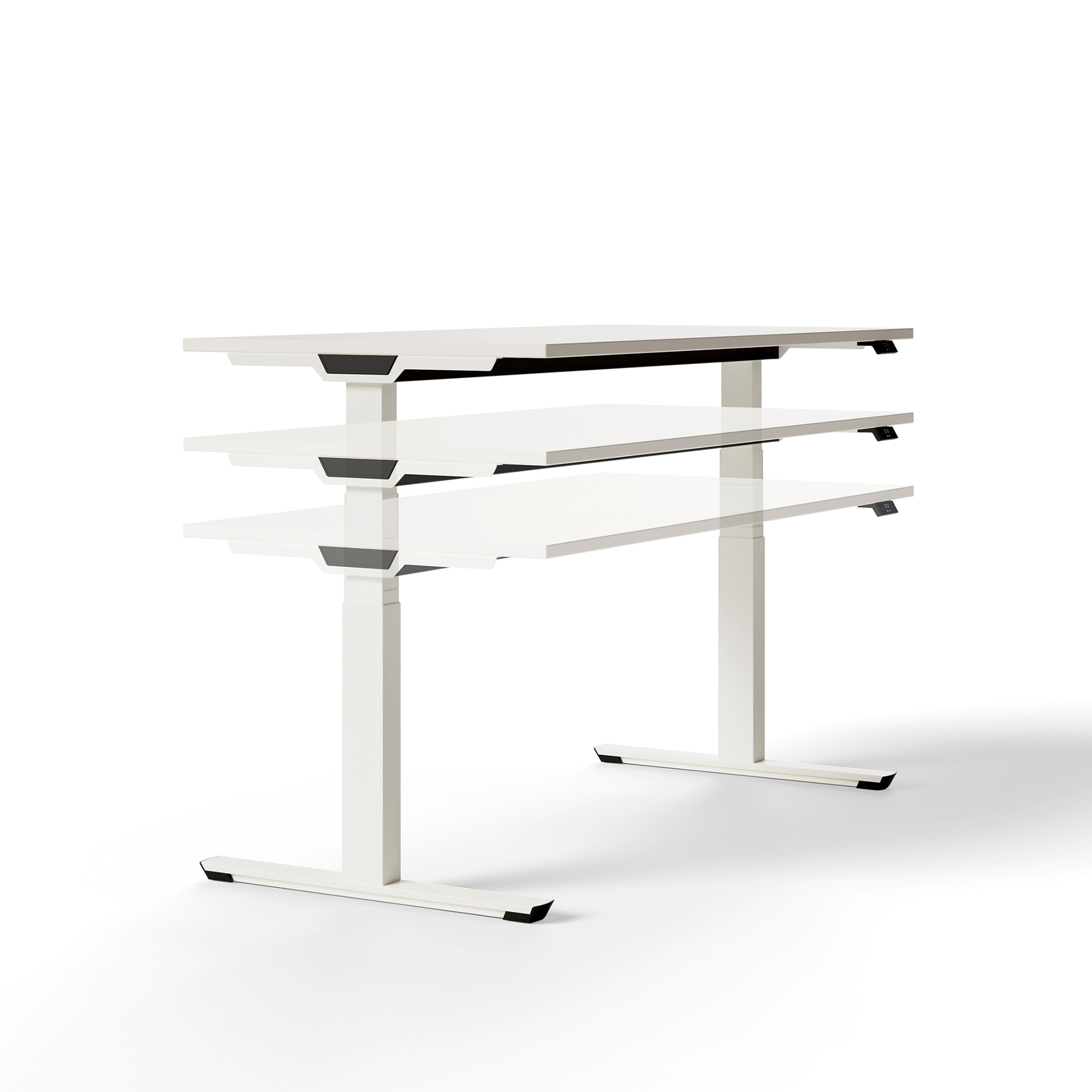 Das hochwertige Gestell mit zwei integrierten Elektromotoren sorgt für einen jederzeit sicheren und wackelfreien Stand. Die Motoren laufen synchron an, sodass die Tischplatte stets waagerecht ausgerichtet ist. Die Tischplatte kann ohne Verbiegen mit bis zu 85 kg belastet werden. Die Tischplatten sind wahlweise aus einer 25 mm dicken Spanplatte oder einer 19 mm starken MDF-Platte. Verschiedene Oberflächen lassen sich individuell zur vorhandenen Einrichtung oder den eigenen Wünschen gestalten. Die MDF-Platten sind zudem mit einer Anti-Finger-Print-Oberfläche lieferbar, welche Fingerabdrücke und Flecken verhindert.