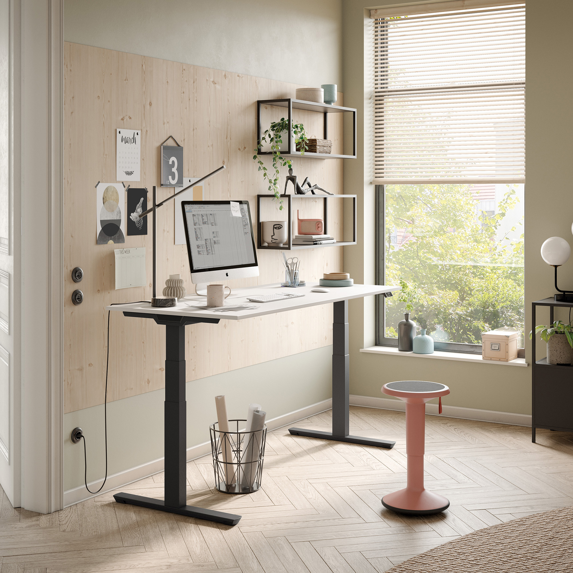Die elektrisch höhenverstellbaren Schreibtische der LIFT.UP Basic-Serie eignen sich besonders für den regelmäßigen Einsatz im Home Office. Die Basic-Tische stechen mit ihrem besonderen Preis-/Leistungsverhältnis hervor. Viele Funktionen der teureren Vergleichsmodelle sind bereits in den Basic-Tischen integriert - jedoch durch eingeschränkte Konfigurierbarkeit (einige ausgewählte Farben für Tischplatten und Gestellen) sowie der Produktion in größeren Massen besonders günstig. Basic 2 ist im Vergleich zu Basic 1 bereits mit einer Memory-Funktion und Display-Anzeige für die Höhe ausgestattet. Gleich drei verschiedene Höhen lassen sich per Tastendruck abspeichern. Das integrierte Steuergerät sorgt zudem für einen sanften Anlauf und Stopp, sodass selbst der Kaffe in Ihrer Tasse nicht ins Wanken gerät. Bei Nichtbedienung schaltet sich das Display automatisch aus um Strom zu sparen und Störfaktoren zu vermeiden. Der Memory-Schalter lässt sich beim Aufbau wahlweise links oder rechts an der Tischplatte montieren. Die erweiterte Arbeitshöhe der Serie Basic 2 bringt ihren neuen elektrisch höhenverstellbaren Schreibtisch auf eien Arbeitshöhe von 64 bis 129 cm und deckt somit bereits ein außerordentlich großes Spektrum ab. Die Schreibtische eignen sich daher sowohl für sehr kleine, als auch sehr große Personen optimal. Angetrieben wird der höhenverstellbare Schreibtisch von zwei Starken Elektromotoren, welche direkt in die Säulen integriert sind. Der Moderne C-Fuß sorgt für einen optimalen Stand und ein geringes Wackeln, selbst auf der maximalen Arbeitshöhe. Die Kufe besticht durch ihr modernes, unauffälliges Design und lässt sich gleichzeitig durch Bodenausgleichsschrauben in eine wackelfreie Position bringen. Highlights und Details in Kurzfassung Nutzlast: 80 kg dynamisch, 140 kg statisch Zwei hochwertige Motoren mit einer Liftgeschwindigkeit von 36 mm pro Sekunde Stylisches Rechteckrohr in 9,5 x 6 cm, 2-stufiges Gestell für eine maximale Höhe von 129 cm Verschiedene Dekore zur Auswahl: Von Ahorn über weiß bis hin zu Asteiche Drei Gestellfarben verfügbar um Ihren Tisch optimal an das Home Office anzupassen Basic 2 ist in drei Größen verfügbar: 120x80 cm, 160x80 cm, 180x80 cm, dieser Artikel besitzt eine Tischplatte in der Größe 120x80 cm Memory-Schalter, links oder rechts montierbar, inklusive Display-Anzeige und drei Speicherplätzen Viel optionales Zubehör (abklappbare Kabelwanne, PC-Halterung, Kabelspiralen) verfügbar Benötigen Sie Unterstützung bei der Einrichtung Ihres neuen Arbeitsplatzes? Wir helfen Ihnen gerne weiter.