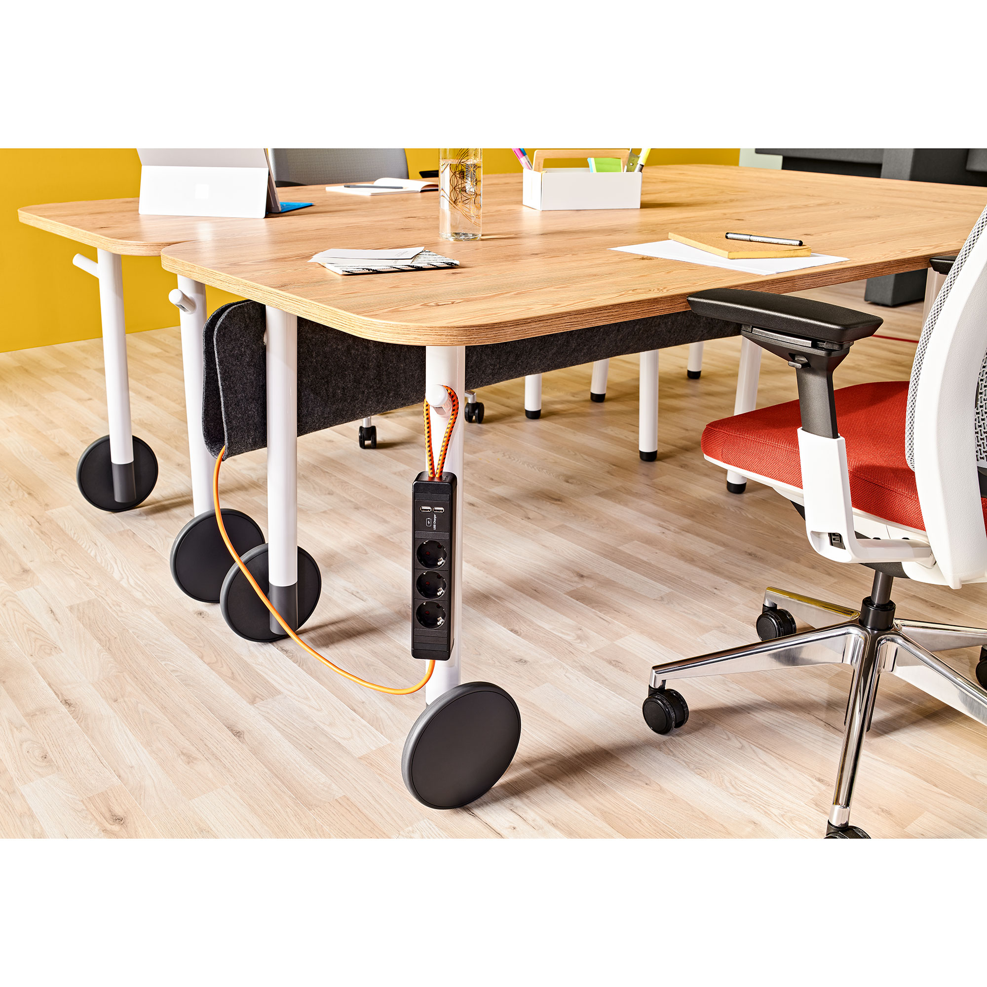 Mit der Flex Collection von Steelcase bleiben Sie dynamisch. Die Flex Collection unterstützt Projektteam bei spontanen Meetings, die jederzeitige Änderung Ihrer Büroräumlichkeiten, Abschottung einzelner Besprechungen durch optische und akustische Barrieren sowie das gemütliche Zusammenkommen am Stehtisch. Alle Elemente der Steelcase Flex Collection lassen sich perfekt kombinieren - ohne Abstriche an Ergonomie oder Design. Neben der hohen Produktionsqualität aller Steelcase Produkte spielt hier auch die Nachhaltigkeit eine große Rolle. Steelcase arbeitet bereits heute CO2-neutral und bald auch CO2-negativ. Alle Elemente der Flex Collection lassen sich selbstverständlich schnell und einfach in unserem 3D-Konfigurator zusammenstellen. Ausstattung des Schreibtisches auf Rollen Arbeitstisch auf Rollen, lässt sich flexibel an jeden beliebigen Ort im Raum transportieren Zwei Rollen, zwei Füße mit Gleitern Die Platte lässt sich individuell gestalten und an Ihr Corporate Design anpassen, wahlweise aus Melamin oder Echtholz (furnierbeschichtete 3-Schicht Güte-Feinspanplatte) Pulverbeschichtetes, robustes Gestell, welches sich ebenfalls farblich anpassen lässt Vier Haken ergänzen das Gestell um nützliche Ablagefläche. Wahlweise lassen sich Ablagekörbe an die Haken hängen, welche sich nahtlos in das Design der Flex Collection einfügen. Die Haken lassen sich selbstverständlich auch für Jacken, Taschen oder Schals nutzen. Tischbreite: Wählen Sie zwischen verschiedenen Tischbreiten von 1.200 mm bis 1.800 mm Plattentiefe: Die Tischplatte ist in 600 mm oder 800 mm Plattentiefe erhältlich Tischhöhe: fix auf 740 mm, dabei handelt es sich um eine Standardhöhe für eine ergonomische Arbeitsweise mit einem Bürodrehstuhl Optionale Kabelaufbewahrung unter dem Tisch erhältich Nutzen Sie unseren Online-Konfigurator für eine Übersicht aller Ausstattungsoptionen Sie benötigen Unterstützung bei der Zusammenstellung Ihrer neuen und flexiblen Büroräumlichkeiten? Unser Planungsteam steht Ihnen gerne jederzeit zur Seite - rufen Sie uns an oder senden Sie uns eine Nachricht.