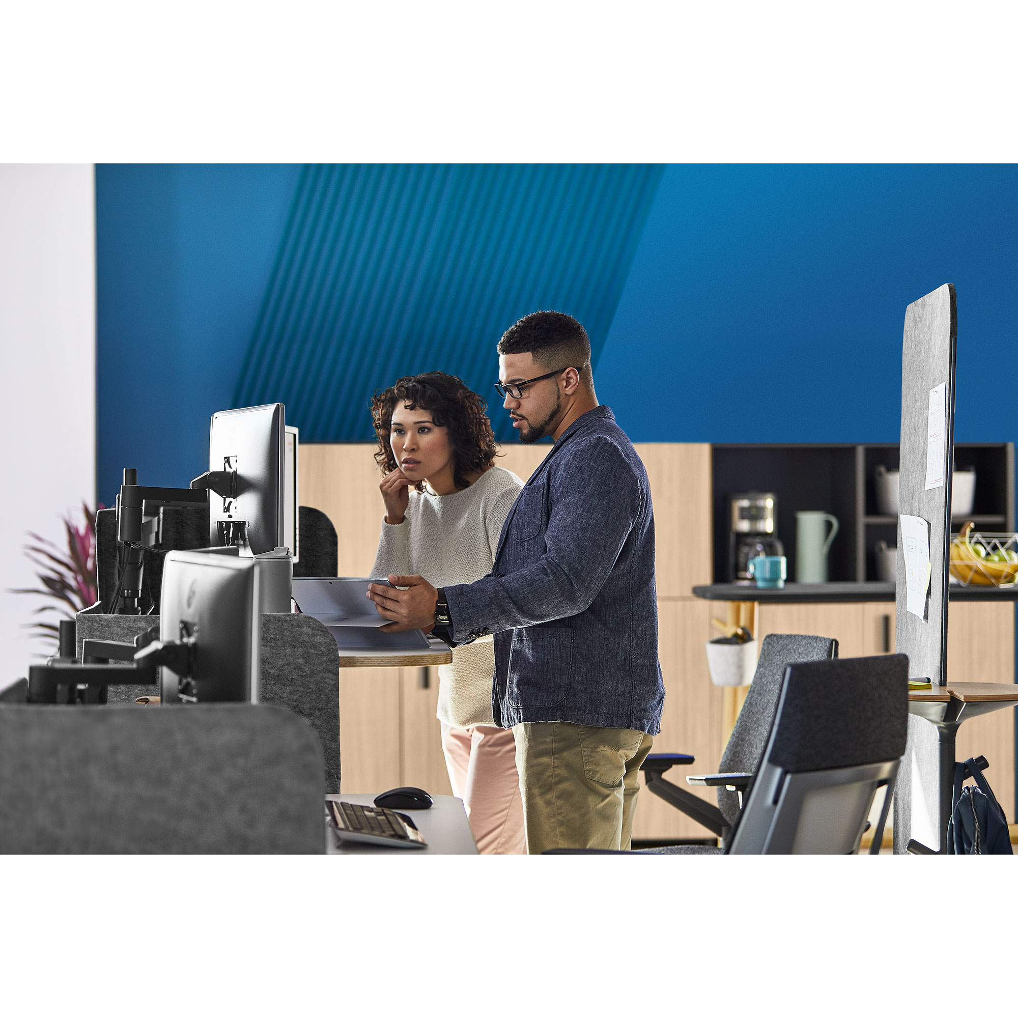 Der Sichtschutz passend zu Ihrem neuen elektrisch höhenverstellbaren Schreibtisch der Steelcase FLEX COLLECTION. Die Trennwand besteht aus zwei einzelnen Teilen und lässt sich per magnetischem Clip schnell und einfach am Tisch montieren. Der Sichtschutz sorgt für eine räumliche Trennung Ihres Arbeitsplatzes vom Rest des Raumes und eignet sich perfekt für ein ruhiges Arbeiten in entspannter Atmosphäre. Der Sichtschutz ist gleichzeitig leicht akustisch wirksam und sorgt damit für mehr Konzentration bei wichtigen Aufgaben. Der Sichtschutz zur Steelcase FLEX COLLECTION ist in drei ansprechenden Farben erhältlich. Passend zu Ihrem höhenverstellbaren Schreibtisch lässt er sich in verschiedenen Breiten von 1.200 mm bis 1.800 mm konfigurieren. Der Filz (Material: gefilztes PET) sorgt für eine angenehme Haptik beim Anfassen. Die Magnete sorgen für eine hohe Stabilität und beugen Beschädigungen und Verletzungen vor. Ergänzen Sie noch heute Ihren höhenverstellbaren Schreibtisch der FLEX COLLECTION um einen angenehmen Sichtschutz. Ausstattungsmerkmale des Steelcase FLEX COLLECTION Screen und Sichtschutzes Erhältlich in Breiten von 1.200 bis 1.800 mm je nach Breite Ihres höhenverstellbaren Schreibtisches Der Screen besteht aus gefilztem PET in hellgrau, dunkelgrau oder persischem Salz Magnetische Halterungen in der Farbe Amsel MG Die Screens werden per Magnet an den Halterungen befestigt, die Halterungen aus Metall werden mit insgesamt sechs Schrauben an der Tischplatte befestigt Der Sichtschutz besteht aus zwei einzelnen Teilen Gewicht: Zwischen 1,1 kg und 1,4 kg Höhe: 300 mm über der Tischplatte und 175 mm unter der Arbeitsplatte Die Screens lassen sich mit einem feuchten Tuch reinigen Weitere Artikel der Steelcase FLEX COLLECTION finden Sie weiter unten oder über die Artikelsuche. Selbstverständlich beraten wir Sie gerne.