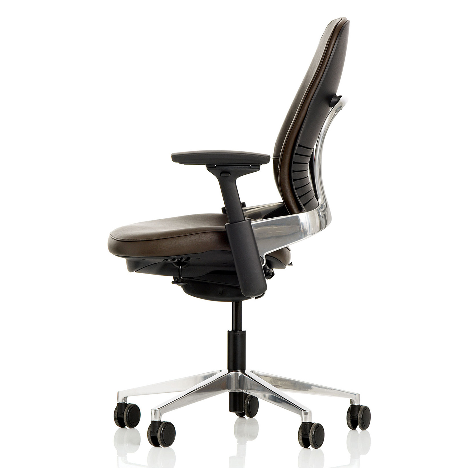 Mit dem ergonomischen Bürostuhl Amia bietet Steelcase einen echten Allrounder. Die angenehme Sitztiefenfederung, höhenverstellbare Lordosenstütze und optionale 4D-Armlehnen kombiniert mit einem Sitzgefühl der Premium-Klasse sorgen für einen stressfreien Arbeitstag. Amia ist natürlich auch perfekt als Gamingstuhl oder für das Home Office geeignet.Die Executive-Version des Steelcase AMIA Bürostuhls kommt direkt mit einem polierten Aluminium-Fußkreuz einher. Der Premium-Bezug Europa-Leder erstrahlt in verschiedenen Farben passend zur Wertigkeit des Stuhls. Selbstverständlich besitzt die Executive-Version 4D-Armlehnen, welche sich im WInkel, in der Breite, der Tiefe und der Höhe verstellen lassen. Optional lässt sich die Executive-Variante auch in der Platinum-Edition mit stylischem Rücken konfigurieren. Ganz wie du willst - in deinem Stil.Unser 3D-Konfigurator ermöglicht die spielend leichte Konfiguration des perfekten Drehstuhls. Alle Bezüge und Farben zur Auswahl - von Polyesterstoffen über Wolle bis hin zu echtem Premium-Leder. Erschaffe noch heute dein Steelcase AMIA Unikat und lasse es dir aufgebaut direkt nach Hause liefern. Ausstattungsmerkmale und KonfigurationsoptionenAuswahl zwischen 2D- und 4D-Armlehnen (höhenverstellbar vs. winkel-, tiefen-, breiten- und höhenverstellbar) - die Executive-Edition besitzt bereits im Standard 4D-Armlehnen.Softex-Polsterung gegen AufpreisIm Standard bereits mit Sitztiefenfederung, Synchronmechanik für ein optimales Sitzgefühl, einer Sitzhöhen- und Tiefenverstellung sowie der Härteverstellung für den Gegendruck der Rückenlehne ausgestattetDie Rückenlehne lässt sich in vorderster Positionen arretieren (feststellen)Verstellbarkeit der Sitztiefe: 76 mmLumbalstütze lässt sich um 96 mm in der Höhe über zwei beidseitige Griffe verstellenVerstellbereich des Härtegrades der Rückenlehne: Von 45 bis 120 kgFußgestell aus poliertem Aluminium (optional auch aus Polyamid-Spritzguss mit Glaserfaservstärkung in schwarz oder platin metallic erhältlich)Verschiedene Bezugsstoffe und Farben zur Auswahl, auf Anfrage senden wir gerne Stoffmuster per PostAbmessungen des Steelcase Amia BürodrehstuhlsGesamthöhe: 990 mmGesamtbreite mit Armlehnen: 680 mmGesamttiefe: 565 mmDurchmesser: 680 mmGewicht mit Armlehnen: 21,90 kgHöhe der Rückenlehne: 540 mmSitztiefe: 395 - 475 mmSitzhöhe: 410 - 525 mmWeitere Fragen zum Steelcase Amia Arbeitsstuhl? Unser kompetentes Beratungsteam hilft gerne weiter - telefonisch oder per Kontaktformular.