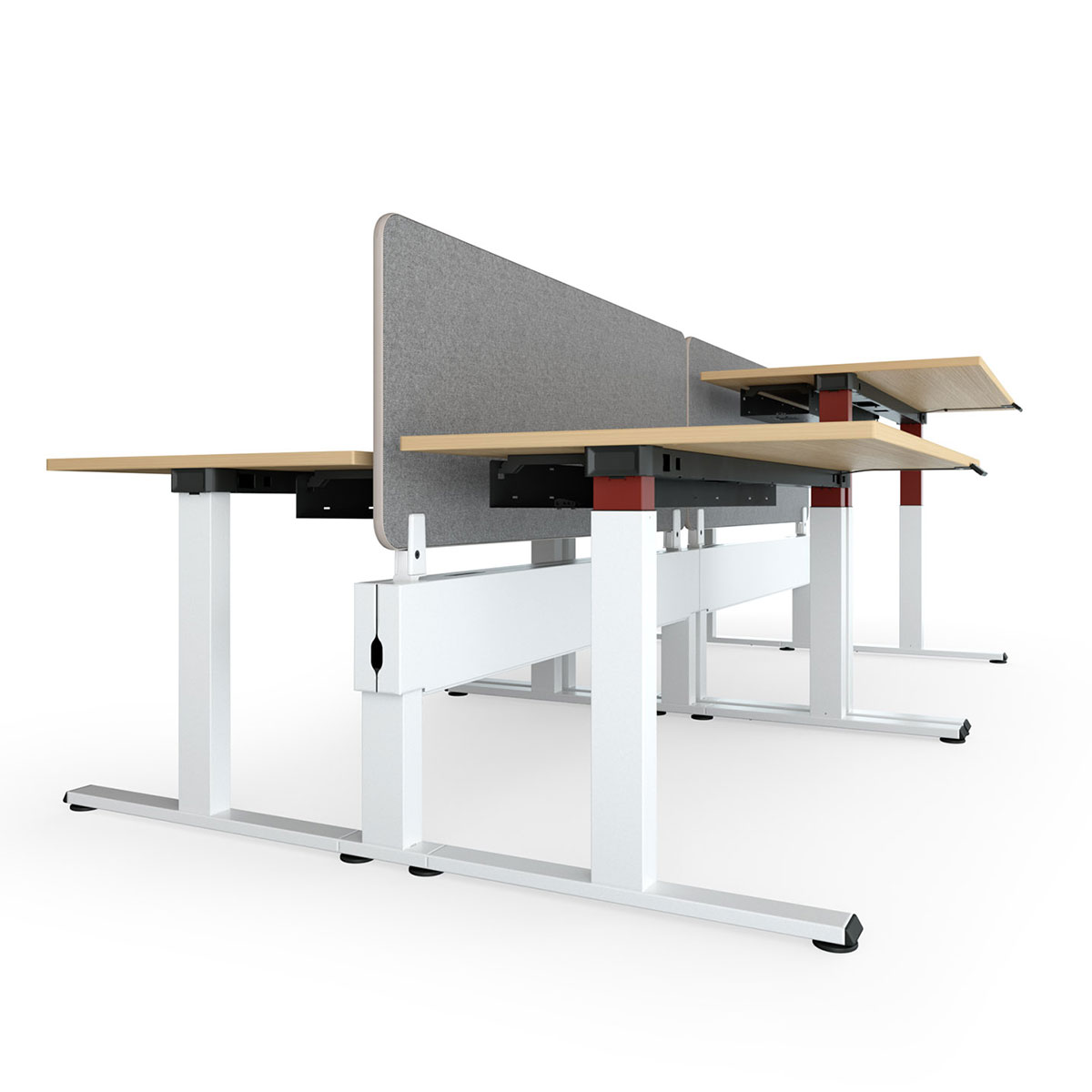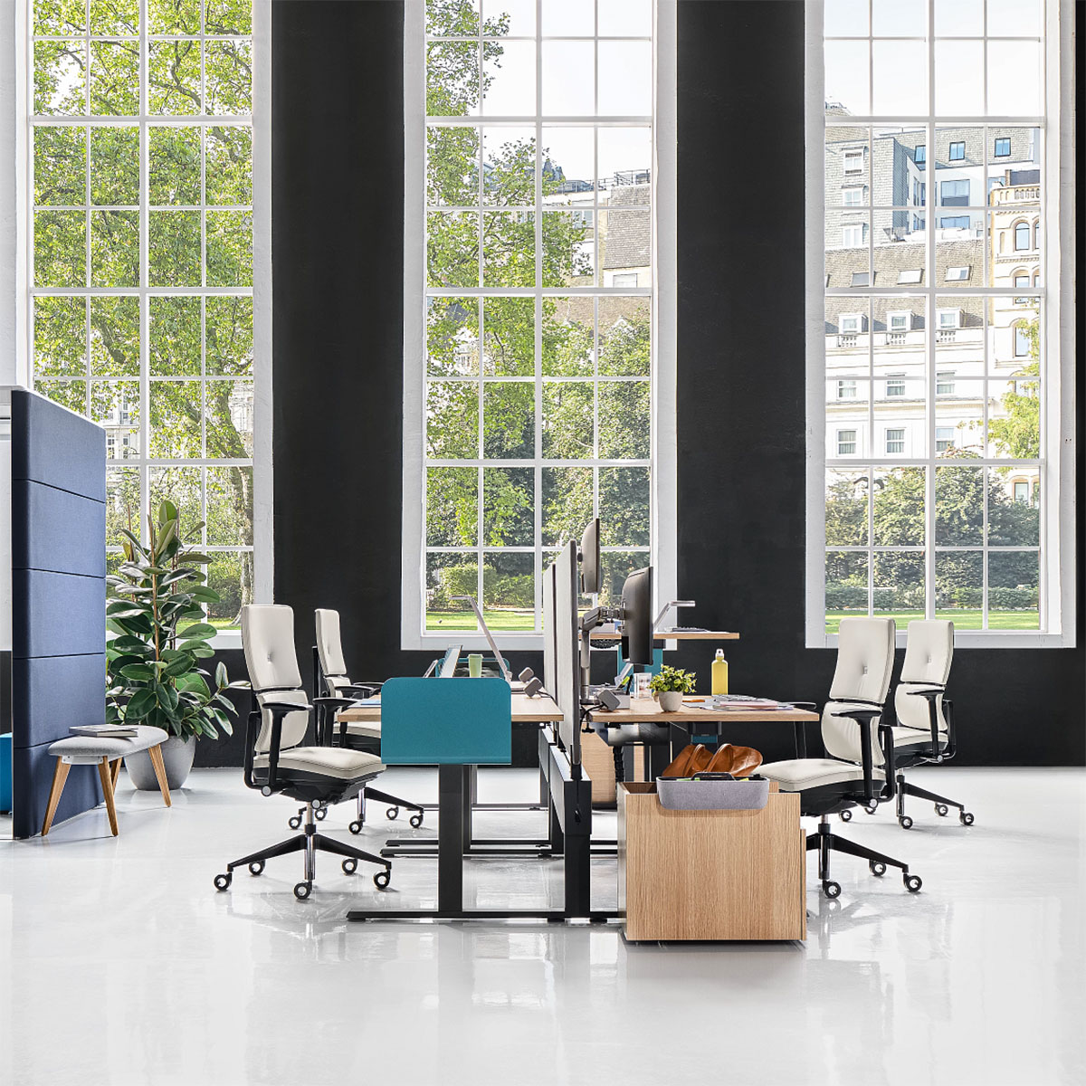 Mit dem höhenverstellbaren Tisch der FLEX COLLECTION lässt es sich jederzeit und überall angenehm arbeiten. Das Highlight der FLEX COLLECTION: Alle Elemente - inklusive den elektrisch höhenverstellbaren Tischen - lassen sich schnell und einfach verschieben, neu anordnen und ermöglichen sowohl spontane Teammeetings als auch optisch getrennte Einzelarbeitsplätze, welche die Konzentration des Nutzers fördern. Die höhenverstellbaren Schreibtische der FLEX COLLECTION besitzen ein einzigartiges Gestell mit vier integrierten Rollen, einer stabilen Quertraverse, eine angenehme Höhenverstellung inklusive zwei Speicherplätzen und viele weitere Features, welche keine Wünsche offen lassen. Der Schreibtisch ist in diversen Breiten von 1.200 mm bis 1.800 mm erhältlich. Weitere Anbauelemente, wie beispielsweise der Auftisch-Sichtschutz für ein räumlich getrenntes Arbeiten sowie der werkzeuglose Kabelkanal unter dem Tisch, bestehen aus einem angenehmen Filzmaterial, welches sich in hochwertiger Weise optisch vom Schreibtisch absetzt. Selbstverständlich bietet der elektrisch höhenverstellbare Schreibtisch der FLEX COLLECTION einen Piezo-Kollisionssensor um Beschädigungen an sonstigen Einrichtungsgegenständen vorzubeugen. Das neuartige Active-Touch-Bedienpanel sorgt für einige Neuerungen unter den elektromotorischen Schreibtischen: Die Double-Tap-Funktion sorgt für eine Höhenverstellung ohne dauerhaftes Drücken von Knöpfen. Der Schreibtisch fährt wie von selbst bis zur gespeicherten Höhe und stoppt im Anschluss ebenso selbstständig. Die Active-Motion-Haltungserinnerung unterstützt Sie beim regelmäßigen Wechseln vom Sitzen zum Stehen und umgekehrt durch ein kurzes, haptisches Signal nach der gewünschten Zeit. Die höhenverstellbaren Schreibtische der Steelcase FLEX COLLECTION lassen sich mit weiterem Zubehör optimal ausstatten: Elektrifizierungsoptionen unter und auf dem Tisch, eine CPU-Halterung, Monitorarme, Sichtschutzwände sowie einem Kabelkanal aus Filz, welcher sich werkzeuglos aufklappen lässt. Konfigurieren Sie noch heute Ihren Traum-Schreibtisch mit der Steelcase FLEX COLLECTION. Ausstattungsmerkmale der elektrisch höhenverstellbaren Tische Elektrische Höhenverstellung von 720 bis 1.200 mm (einstufiges Gestell) Tischplattenbreite: Wählbar von 1.200 bis 1.800 mm Tischplattentiefe: 600 mm oder 800 mm Quertraverse sorgt für einen stabilen Halt, die Designer-Fußgestelle werden direkt an der Traverse befestigt Gestell mit vier Rollen und zusätzlichen Standfüßen für einen sicheren Stand und eine sekundenschnelle Mobilisierung des Tisches Bereits im Standard mit einem Active-Touch-Bedienpanel ausgestattet, welches zwei Memory-Plätze bietet, mit der Touble-Tap-Funktion eine automatische Höhenverstellung mit sich bringt sowie per App steuerbar ist Piezo-Kollisionssensor Integriertes 3m-Stromkabel Optionale Elektrifizierung unter dem Tisch - wahlweise mit sechs Steckdosen oder neun Steckdosen - und auf dem Tisch, wahlweise mit Strom oder Strom und USB-Ladebuchsen Kabelkanal aus kunstvoll geformten und stabilen PET-Filz erhältlich Tischplatte in allen Farben aus der Steelcase Oberflächenkollektion konfigurierbar Das Gestell lässt sich farblich von der Tischplatte absetzen, vielen moderne Farben wie Aubergine oder Wasabi zur Auswahl Optionale CPU-Halterung sowie ein Sichtschutz mit Magnethalterung über die Artikelsuche verfügbar Gewicht: Je nach Breite und Optionen von 45 kg bis 56,7 kg Sind weitere Fragen offen oder benötigen Sie ein individuelles Angebot für Ihre Betriebsausstattung oder Ihr neues Home Office? Wir stehen Ihnen mit unseren Einrichtungsexperten gerne telefonisch und per E-Mail zur Verfügung.