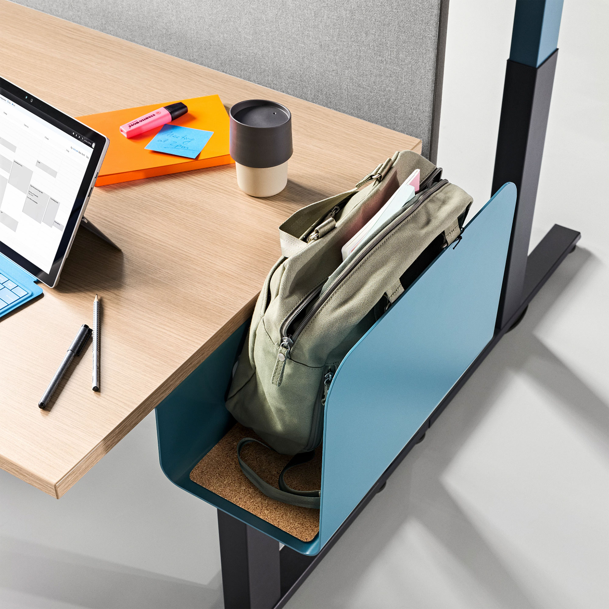 Der passende CPU-Halter für Ihren neuen FLEX COLLECTION Schreibtisch mit elektrischer Höhenverstellung. Verstecken Sie sichtbare Kabel unter der Tischplatte - halten Sie den Boden frei. Die PC-Halterung sorgt für eine Höhenverstellung ohne auf die Länge der Kabel oder die Höhe des Computers achten zu müssen. Die einfache Befestigung an der Quertraverse verhindert Löcher in der Arbeitsplatte und schont somit Ihren Tisch. Die CPU-Halterung ist für alle Computer mit einer maximalen Höhe von 430 mm und einer Breite von 120 bis 200 mm geeignet. Die maximale Tragfähigkeit beträgt 15 kg. Der CPU-Halter besteht aus pulverbeschichtetem Stahl und lässt sich in vier modernen Farben passend zu Ihrem elektrisch höhenverstellbaren Schreibtisch der FLEX COLLECTION gestalten. Ausstattung des CPU-Halters der Steelcase FLEX COLLECTION Passend zu den höhenverstellbaren Schreibtischen der Steelcase FLEX COLLECTION Tragfähigkeit für Computer mit einem Gewicht von bis zu 15 kg Maximale Abmessungen des Computers: 430 mm in der Höhe und 120 bis 200 mm in der Breite Material: Pulverbeschichteter Stahl mit Expoxydharz Adapter aus Aluminium Einfache Befestigung mit zwei Schrauben an der Quertraverse der FLEX COLLECTION Tische Positionierung innen und außen sowie links und rechts am höhenverstellbaren Schreibtisch möglich