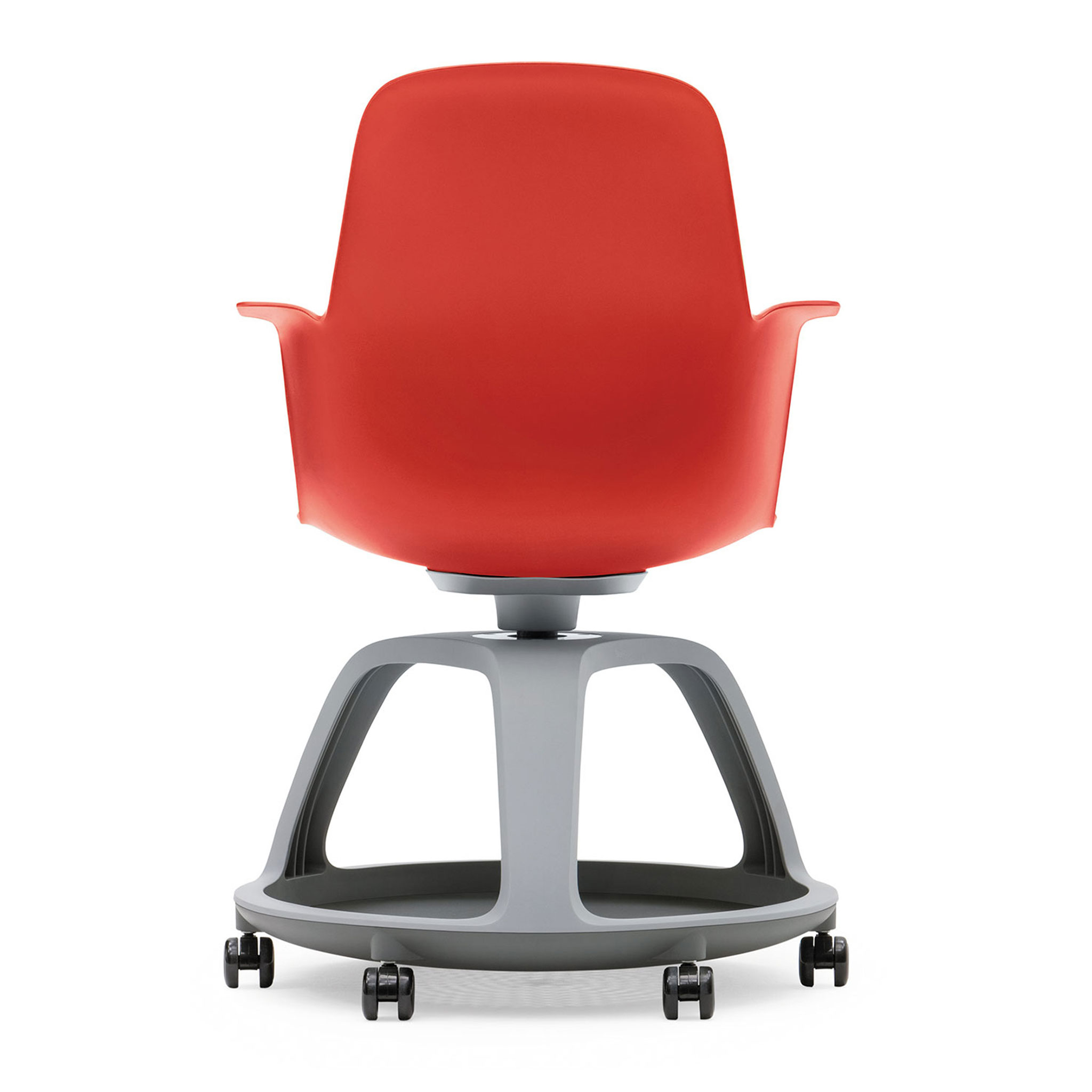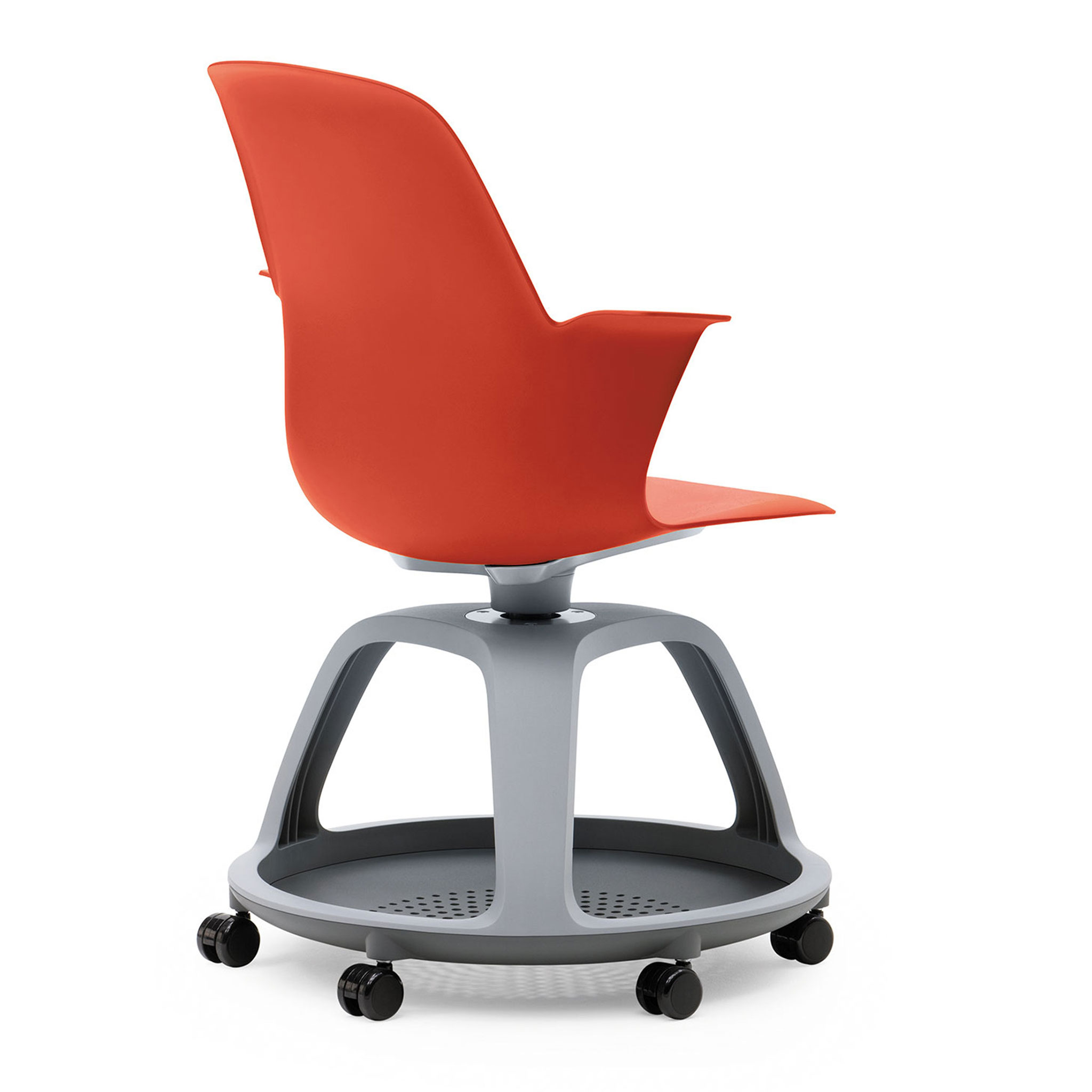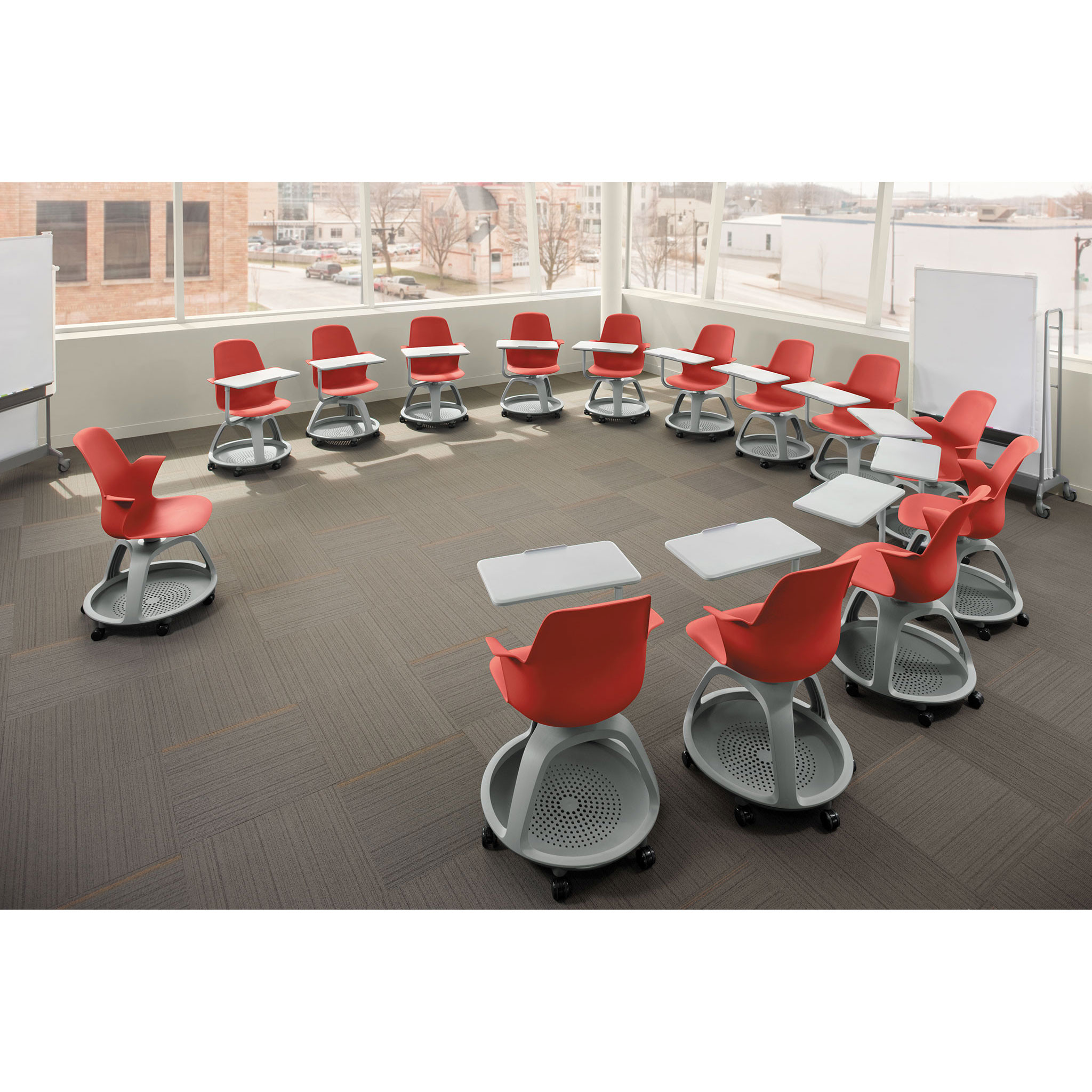 Perfekt zum Arbeiten und Lernen in Seminaren oder im Unterricht - der neue Steelcase NODE. Steelcase NODE vereint alle Eigenschaften für einen dynamischen und modernen Unterricht in Schulen, Universitäten oder Seminarräumen: Das flexible Schreibtablar sowie genügend Stauraum unterhalb des Seminarstuhls. Die angenehm geformte Sitzschale sorgt auch bei längerem Sitzen für alle nötigen, ergonomischen Aspekte. Die Designer-Rollen unter dem Fußkreuz sorgen für eine schnelle und einfache Anordnung der Stühle für Ihren Unterricht oder Ihre Seminare. Stellen Sie die Stühle heute doch einfach einmal in einem Halbkreis auf. Durch die Ablagefläche unter den Stühlen wird garantiert kein Schüler oder Seminarteilnehmer über Rucksäcke, Taschen oder Getränke stolpern. Eine völlig neue Art des Unterrichtens - nur mit Steelcase NODE. Das Steelcase Node Aktionsmodell in der Farbe Orange ist bereits komplett ausgestattet und sofort lieferbar - statten Sie Ihre Seminarräume oder Hörsäle noch in diesem Jahr kostengünstig aus. Ausstattungsmerkmale und Highlights Mobiler Seminarstuhl auf Rollen für mehr Dynamik im Unterricht Geeignet für Seminarräume, Klassenräume und Meetingbereiche in Unternehmen Modernes Design, gemütliche Sitzschale aus hochwertigem Kunststoff in der Farbe Orange Integriertes Schreibtablar Lange Haltbarkeit durch hochwertige Materialien Der Fokus bei Steelcase liegt auf Nachhaltigkeit - 75 % des eingesetzten Materials lassen sich recyclen Ergonomisch geformte Sitzschale für einen besten Sitzkomfort Einfache Montage und Demontage Schnelle Lieferung, sofort verfügbar Sind Sie an einer größeren Menge interessiert? Schreiben Sie uns an - wir erstellen Ihnen gerne ein attraktives Angebot. Abmessungen Sitzhöhe: 440 mm Nutztiefe der Sitzfläche: 470 mm Breite der Sitzfläche: 475 mm Höhe der Rückenlehne: 490 mm Neigung der Rückenlehne: 15° Breite der Rückenlehne: 380 mm Gesamthöhe: 900 mm Gesamtbreite: 835 mm Gesamttiefe: 800 mm Gewicht: 13,6 kg