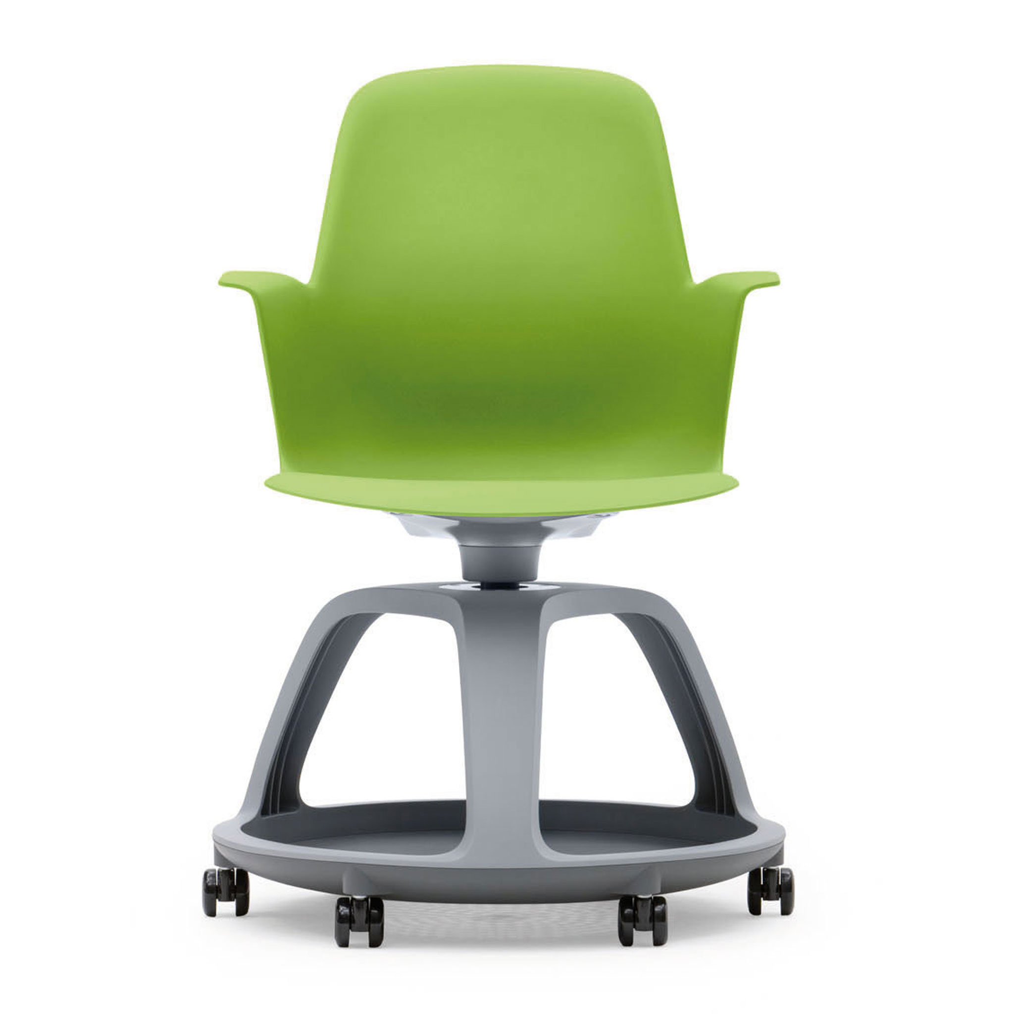 Perfekt zum Arbeiten und Lernen in Seminaren oder im Unterricht - der neue Steelcase NODE. Steelcase NODE vereint alle Eigenschaften für einen dynamischen und modernen Unterricht in Schulen, Universitäten oder Seminarräumen: Das flexible Schreibtablar sowie genügend Stauraum unterhalb des Seminarstuhls. Die angenehm geformte Sitzschale sorgt auch bei längerem Sitzen für alle nötigen, ergonomischen Aspekte. Die Designer-Rollen unter dem Fußkreuz sorgen für eine schnelle und einfache Anordnung der Stühle für Ihren Unterricht oder Ihre Seminare. Stellen Sie die Stühle heute doch einfach einmal in einem Halbkreis auf. Durch die Ablagefläche unter den Stühlen wird garantiert kein Schüler oder Seminarteilnehmer über Rucksäcke, Taschen oder Getränke stolpern. Eine völlig neue Art des Unterrichtens - nur mit Steelcase NODE. Das Steelcase Node Aktionsmodell in der Farbe Wasabi ist bereits komplett ausgestattet und sofort lieferbar - statten Sie Ihre Seminarräume oder Hörsäle noch in diesem Jahr kostengünstig aus. Ausstattungsmerkmale und Highlights Mobiler Seminarstuhl auf Rollen für mehr Dynamik im Unterricht Geeignet für Seminarräume, Klassenräume und Meetingbereiche in Unternehmen Modernes Design, gemütliche Sitzschale aus hochwertigem Kunststoff in der Farbe Wasabi Integriertes Schreibtablar Lange Haltbarkeit durch hochwertige Materialien Der Fokus bei Steelcase liegt auf Nachhaltigkeit - 75 % des eingesetzten Materials lassen sich recyclen Ergonomisch geformte Sitzschale für einen besten Sitzkomfort Einfache Montage und Demontage Schnelle Lieferung, sofort verfügbar Sind Sie an einer größeren Menge interessiert? Schreiben Sie uns an - wir erstellen Ihnen gerne ein attraktives Angebot. Abmessungen Sitzhöhe: 440 mm Nutztiefe der Sitzfläche: 470 mm Breite der Sitzfläche: 475 mm Höhe der Rückenlehne: 490 mm Neigung der Rückenlehne: 15° Breite der Rückenlehne: 380 mm Gesamthöhe: 900 mm Gesamtbreite: 835 mm Gesamttiefe: 800 mm Gewicht: 13,6 kg