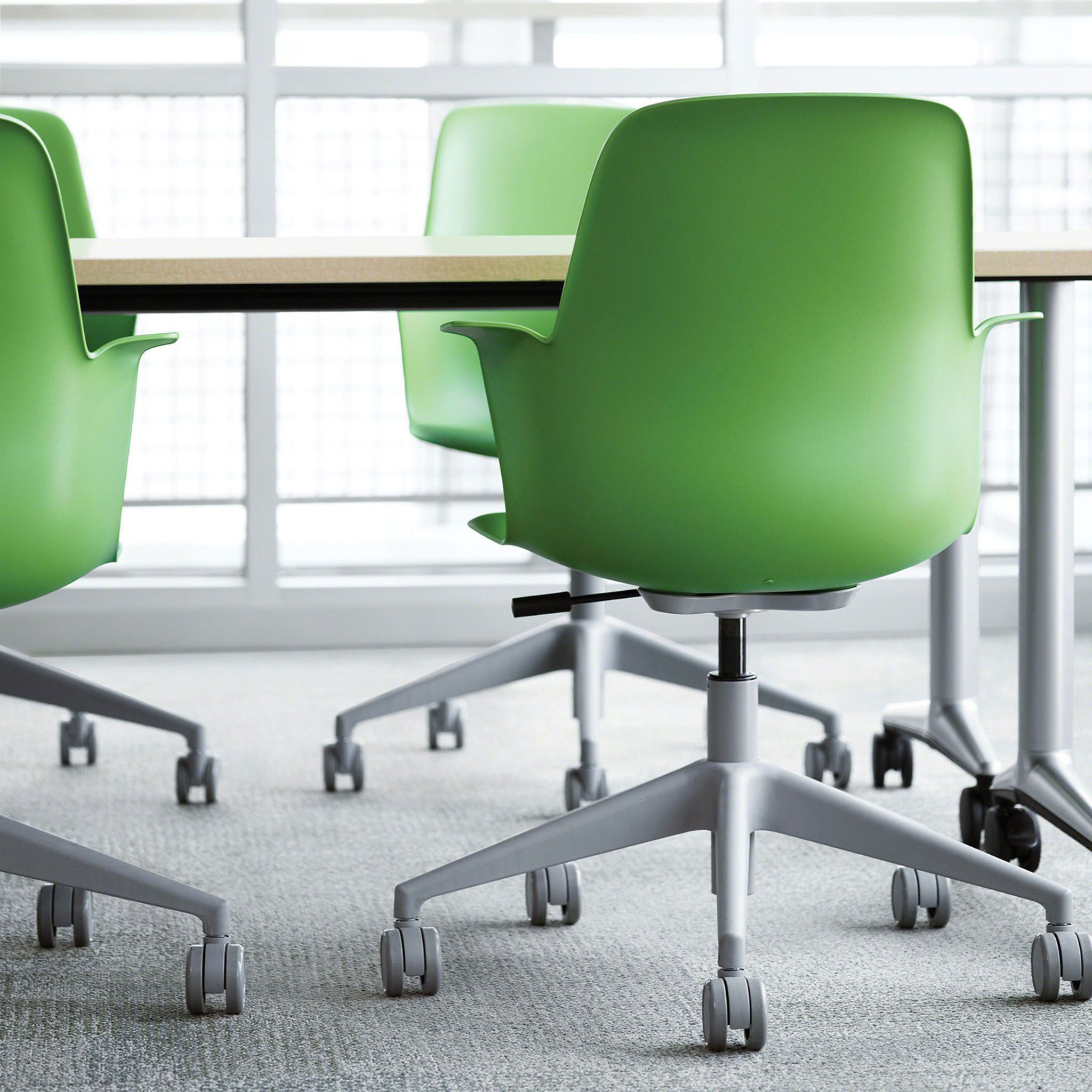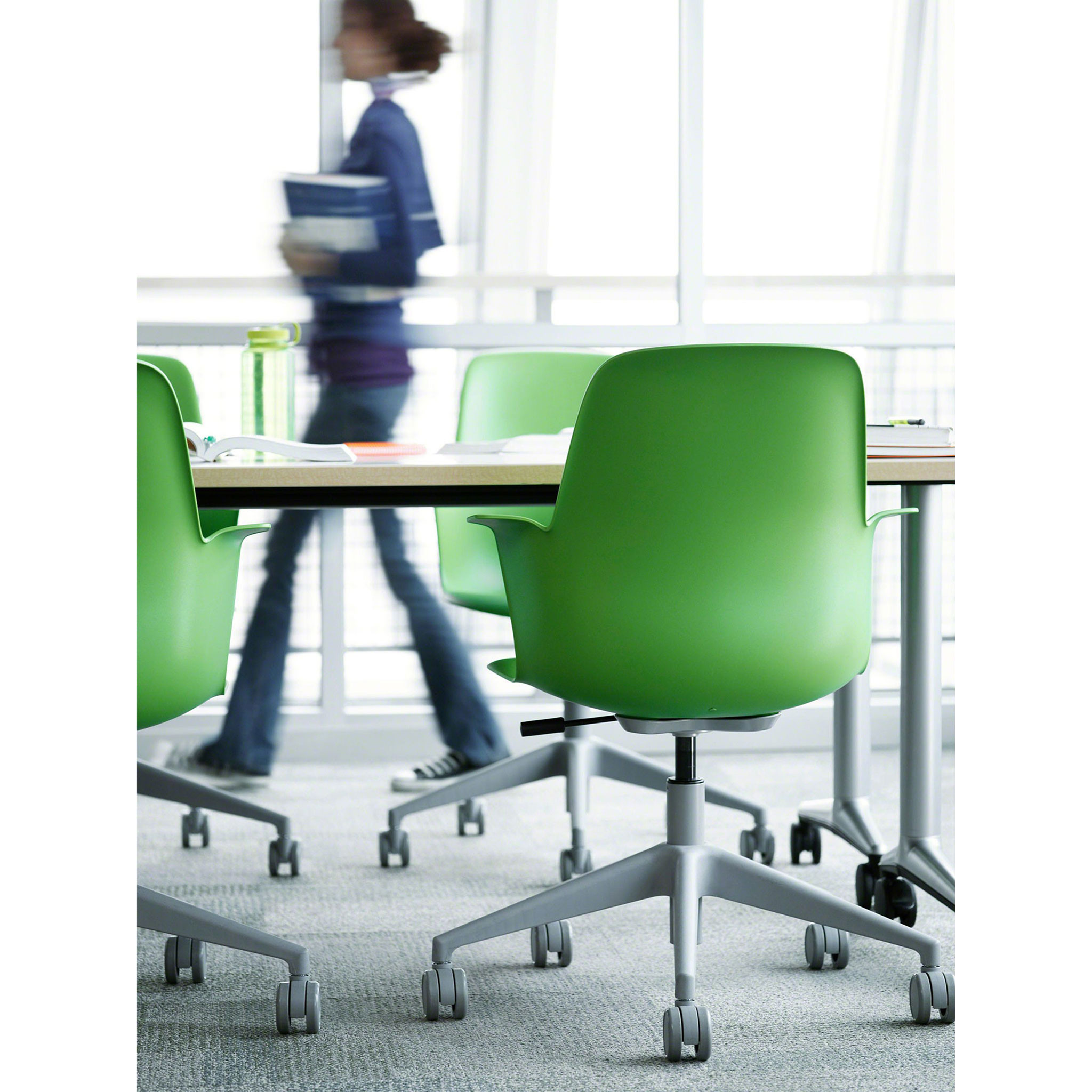 Perfekt zum Arbeiten und Lernen in Seminaren oder im Unterricht - der neue Steelcase NODE. Steelcase NODE vereint alle Eigenschaften für einen dynamischen und modernen Unterricht in Schulen, Universitäten oder Seminarräumen: Das flexible Schreibtablar sowie genügend Stauraum unterhalb des Seminarstuhls. Die angenehm geformte Sitzschale sorgt auch bei längerem Sitzen für alle nötigen, ergonomischen Aspekte. Die Designer-Rollen unter dem Fußkreuz sorgen für eine schnelle und einfache Anordnung der Stühle für Ihren Unterricht oder Ihre Seminare. Stellen Sie die Stühle heute doch einfach einmal in einem Halbkreis auf. Durch die Ablagefläche unter den Stühlen wird garantiert kein Schüler oder Seminarteilnehmer über Rucksäcke, Taschen oder Getränke stolpern. Eine völlig neue Art des Unterrichtens - nur mit Steelcase NODE. Das Steelcase Node Aktionsmodell in der Farbe Wasabi ist bereits komplett ausgestattet und sofort lieferbar - statten Sie Ihre Seminarräume oder Hörsäle noch in diesem Jahr kostengünstig aus. Ausstattungsmerkmale und Highlights Mobiler Seminarstuhl auf Rollen für mehr Dynamik im Unterricht Geeignet für Seminarräume, Klassenräume und Meetingbereiche in Unternehmen Modernes Design, gemütliche Sitzschale aus hochwertigem Kunststoff in der Farbe Wasabi Integriertes Schreibtablar Lange Haltbarkeit durch hochwertige Materialien Der Fokus bei Steelcase liegt auf Nachhaltigkeit - 75 % des eingesetzten Materials lassen sich recyclen Ergonomisch geformte Sitzschale für einen besten Sitzkomfort Einfache Montage und Demontage Schnelle Lieferung, sofort verfügbar Sind Sie an einer größeren Menge interessiert? Schreiben Sie uns an - wir erstellen Ihnen gerne ein attraktives Angebot. Abmessungen Sitzhöhe: 440 mm Nutztiefe der Sitzfläche: 470 mm Breite der Sitzfläche: 475 mm Höhe der Rückenlehne: 490 mm Neigung der Rückenlehne: 15° Breite der Rückenlehne: 380 mm Gesamthöhe: 900 mm Gesamtbreite: 835 mm Gesamttiefe: 800 mm Gewicht: 13,6 kg