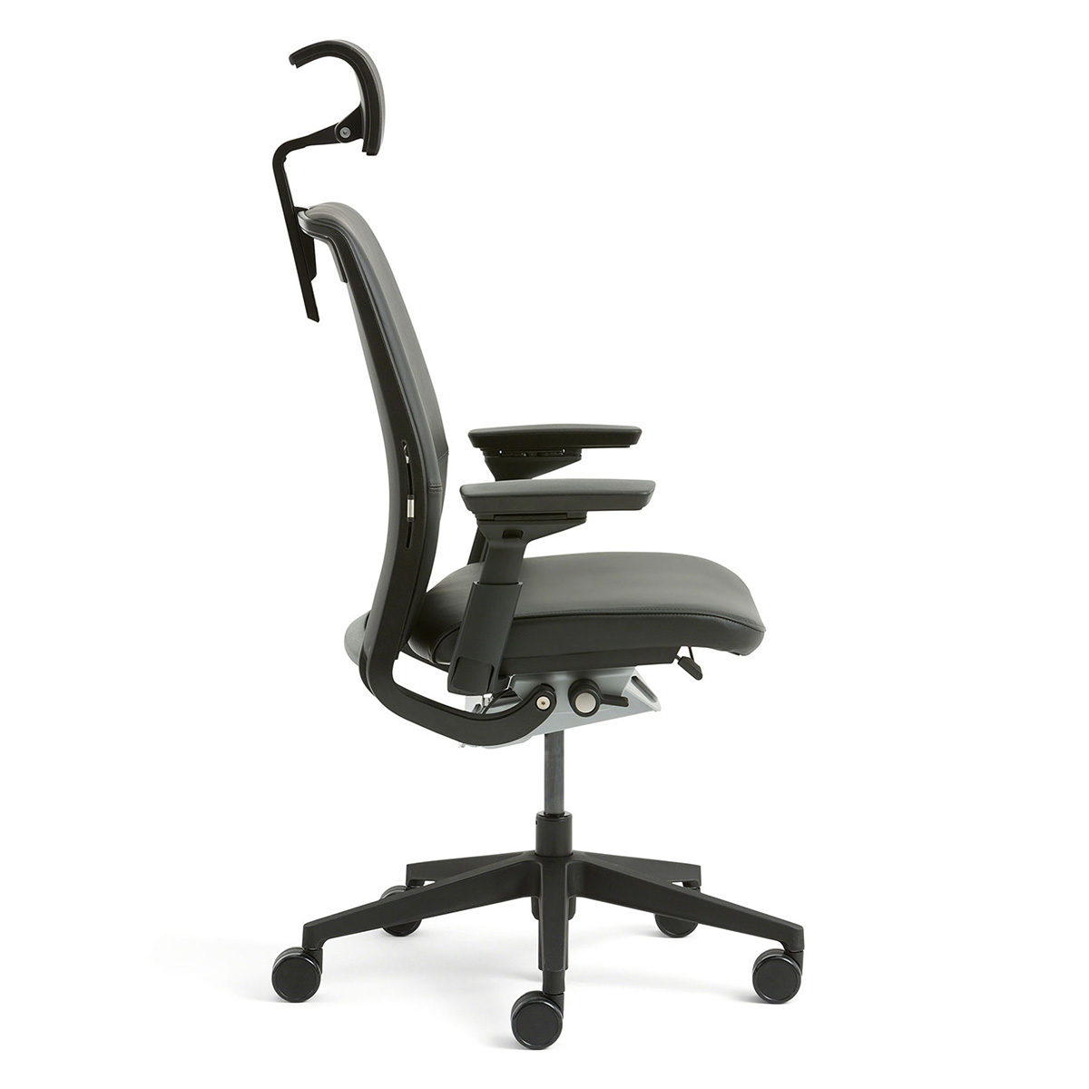 Der Steelcase Leap V2 in der Premium-Ausführung besticht durch seinen Lederbezug Europaleder in verschiedenen Farben und dem optionalen, polierten Fußkreuz aus Aluminium. Selbstverständlich macht dieses Modell keine Abstriche an Design und Funktionalität - der farblich abgesetzte Rückenlehnenträger sorgt für ein optisches Highlight, sobald man das Home Office oder Chefbüro betritt. Die Lamellen der Rückenlehne sorgen für eine angenehme Luftzirkulation an längeren Arbeitstagen. Die Armlehnen des Steelcase Leap V2 Executive Chairs mit Kopfstütze lassen sich optional in alle Richtungen verstellen und polstern. So ist auch bei längeren Tagen im Büro für eine angenehme Ablage der Arme gesorgt.Ausstattung des Steelcase Leap V2 Executive ChairsLederbezug Europaleder in verschiedenen FarbenIntegrierte Kopfstütze zur Entlastung der HalswirbelsäuleDer Rücken des Steelcase Leap ist in schwarz gehalten, der polierte Aluminium-Bügel setzt sich farblich zur Akzentsetzung abLordosenstütze mit optionaler HöheneinstellungKunststoffarmlehnen, welche sich wahlweise nur in der Höhe oder in Höhe, Breite, Winkel und Tiefe verstellen lassen. Die Armlehnen sind zusätzlich polsterbar.Das Fußkreuz besteht aus poliertem Aluminium, wahlweise lässt es sich in schwarz oder platin metallic pulverbeschichtenMechanik mit Natural Glide System für eine natürliche BewegungSitzhöhenverstellungHärteeinstellung der RückenlehneDie Rückenlehne lässt sich auch in vorderster Position arretierenVerstellen Sie die Sitztiefe schnell und einfach per Hebel unter dem SitzIntegrierte Sitztiefenfederung für ein angenehmes Hinsetzen und AufstehenAbmessungen des Steelcase Leap V2 PremiumSitztiefe: 400 - 475 mmSitzhöhe: 415 - 515 mmBreite der Sitzfläche: 490 mmNeigung der Sitzfläche: -7°Höhe der Rückenlehne über dem Sitz: 595 mmArmlehnenhöhe über dem Sitz: 180 - 280 mmGesamthöhe: 1070 mmGesamtbreite: 680 mmGesamttiefe: 620 mm
