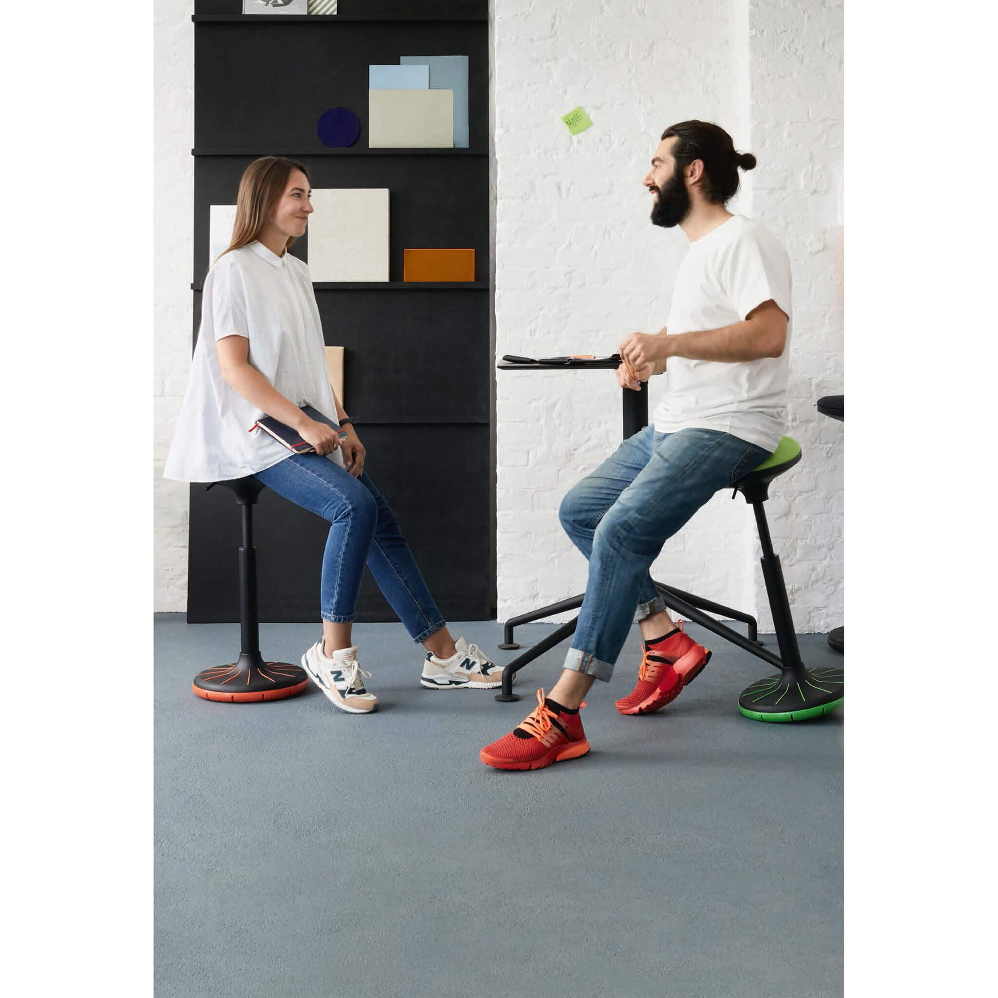 Sowohl Sohle als auch der Fuß lassen sich farblich vom schwarzen Untergestell des W3 Hockers absetzen. Derzeit stehen vier stylische Farben zur Auswahl: Schwarz, weiß, orange und grün. Die Farben spiegeln sich sowohl unter dem Fuß als auch in den eingelassenen Rillen der unteren Plattform wider.